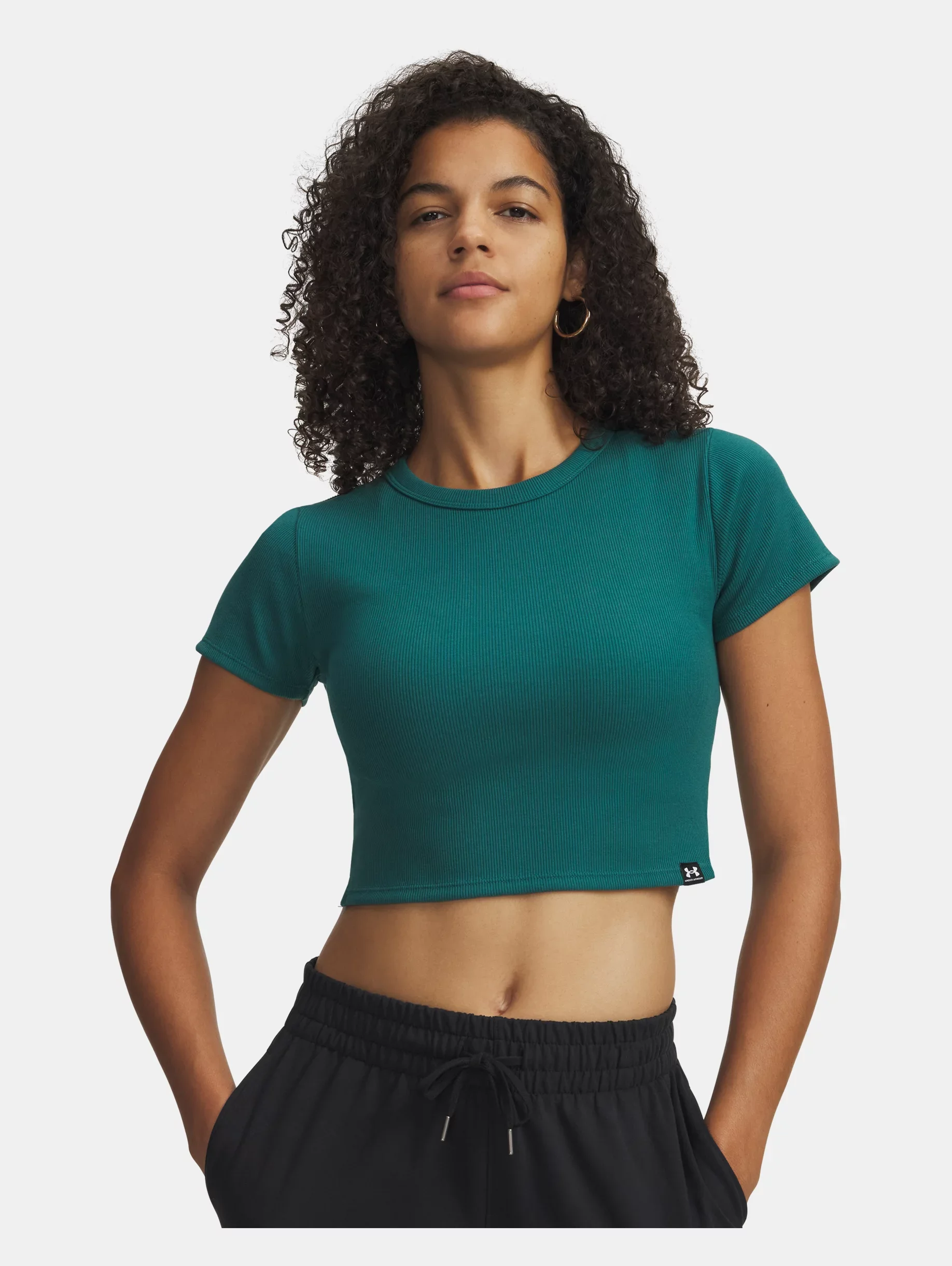 UA Rival Rib essentials are a must for every athlete.The classic ribbed fabric is soft and stretchy and the cropped fit makes for easy layering. Product Details - Soft ribbed fabric is lightweight & comfortable - 4-way stretch material moves better in every direction - Cropped body length with side-vent hem - Main body fabric contains at least 30% recycled polyester, excluding trims & embellishments Size & Fit - Streamlined fit that's not too tight or too loose. Space & Care - Style #: 6000264 - 57% Cotton/38% Polyester/5% Elastane - Imported