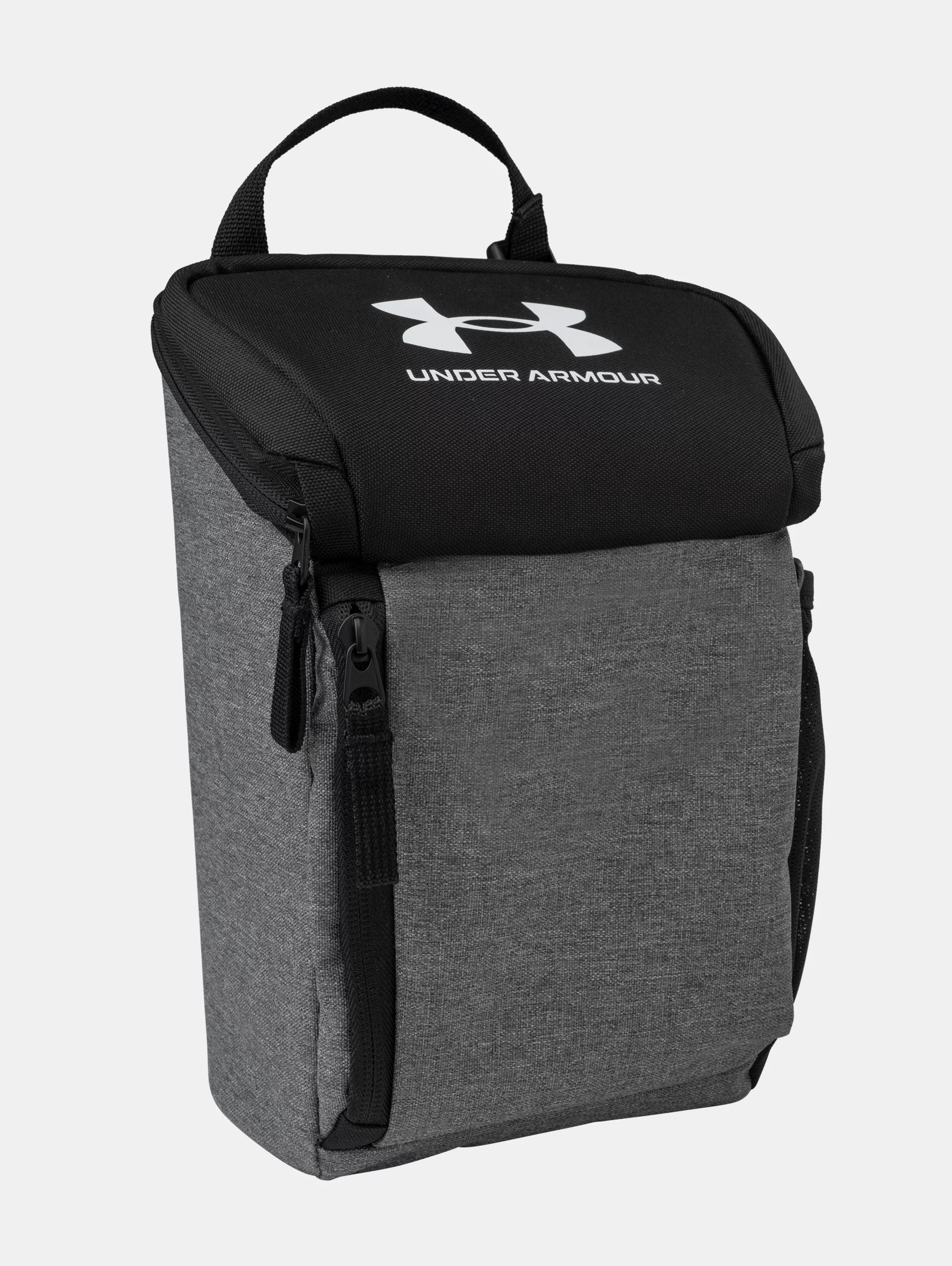 Stores multiple drinks, lunch, or other fuel for your hardest practices, with a comfortable handle for carrying that can also clip on to your bag. Product Details - Water-resistant UA Storm technology on exterior fabric keeps your stuff dry - Wide top opening for easy loading & rigid waterproof liner for easy cleaning - Large zippered front storage pocket & side mesh pocket that fits a water bottle - Built-in clip for easy hang-up - Top grab handle for easy carrying with quick-release clip for attaching to backpack - *Backpack sold separately Size & Fit - One Size Fits All Space & Care - Style #: 1382555 - BPA- & lead-free - Dimensions: 10.5" H x 7.5" W x 5.5" D - Weight: .75 lbs - Imported