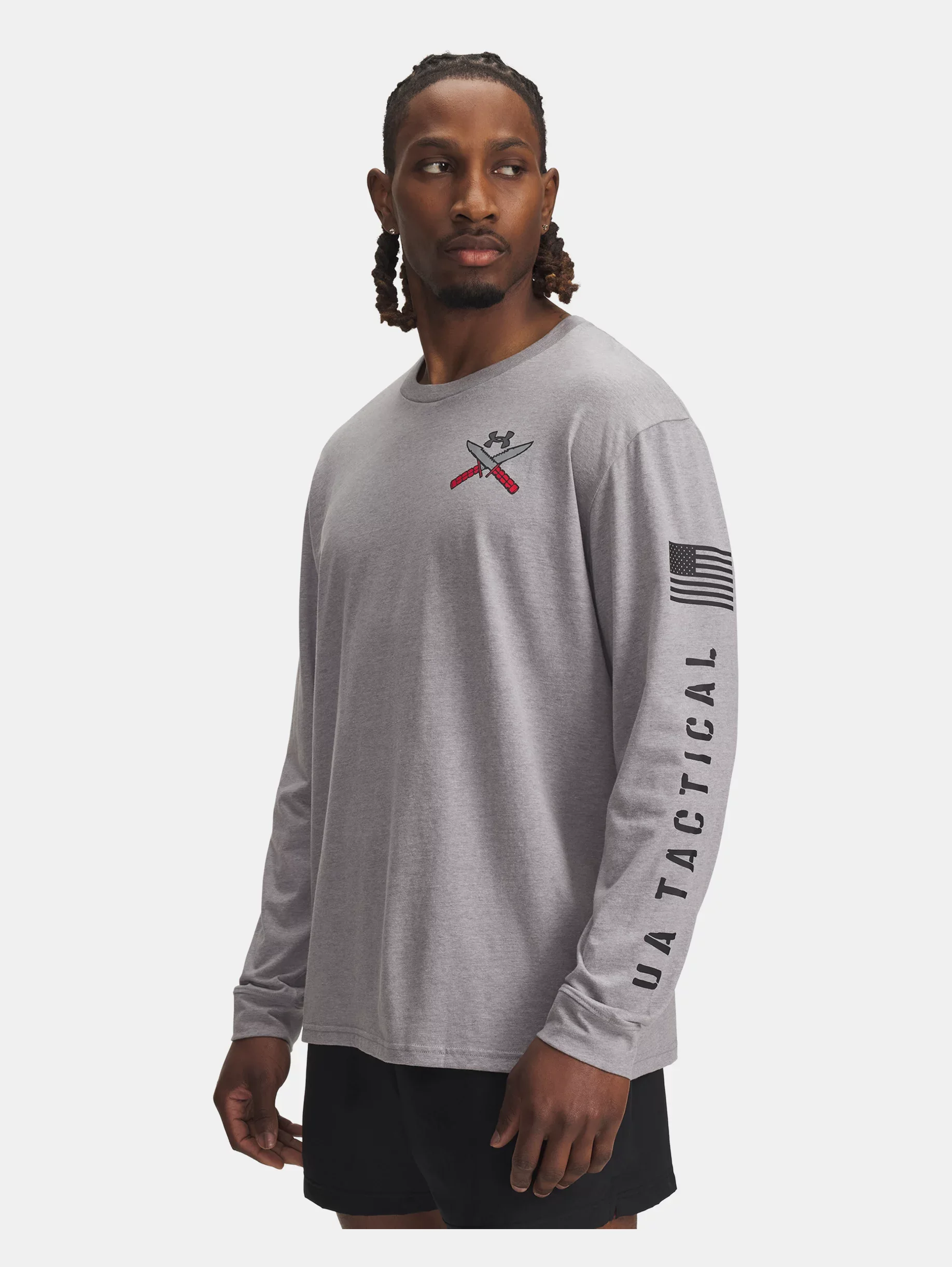Everyone makes graphic Ts...but Under Armour makes them better.This long sleeve shirt features tactical graphics and light, soft, quick-drying fabric. Product Details - Super-soft, cotton-blend fabric provides all-day comfort - Ribbed collar - Main body fabric contains at least 40% recycled polyester, excluding trims & embellishments Size & Fit - Fuller cut for complete comfort. Space & Care - Style #: 6005243 - 60% Cotton/40% Polyester - Imported