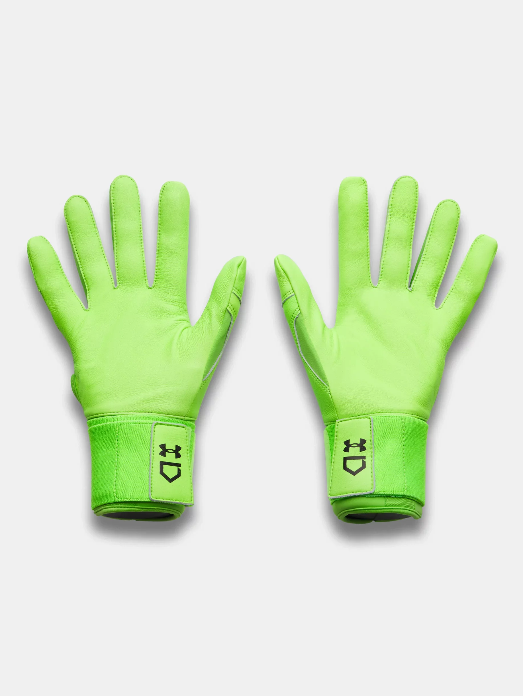 Your go-to batting gloves.Premium leather in the palm for the right feel and a longer cuff for added wrist support and power. Product Details - Premium leather palm for ultimate feel - Lightweight, stretchy HeatGear® fabric on back of hand with leather overlays for added support - Perforations on fingers for strategic ventilation - Stretchy neoprene wrist with adjustable strap provides extended wrist support Size & Fit - Adjustable Space & Care - Style #: 6009230 - Sold in pairs - 54% Leather/20% Polyester/11% Nylon/8% Rubber/7% Elastane - Imported