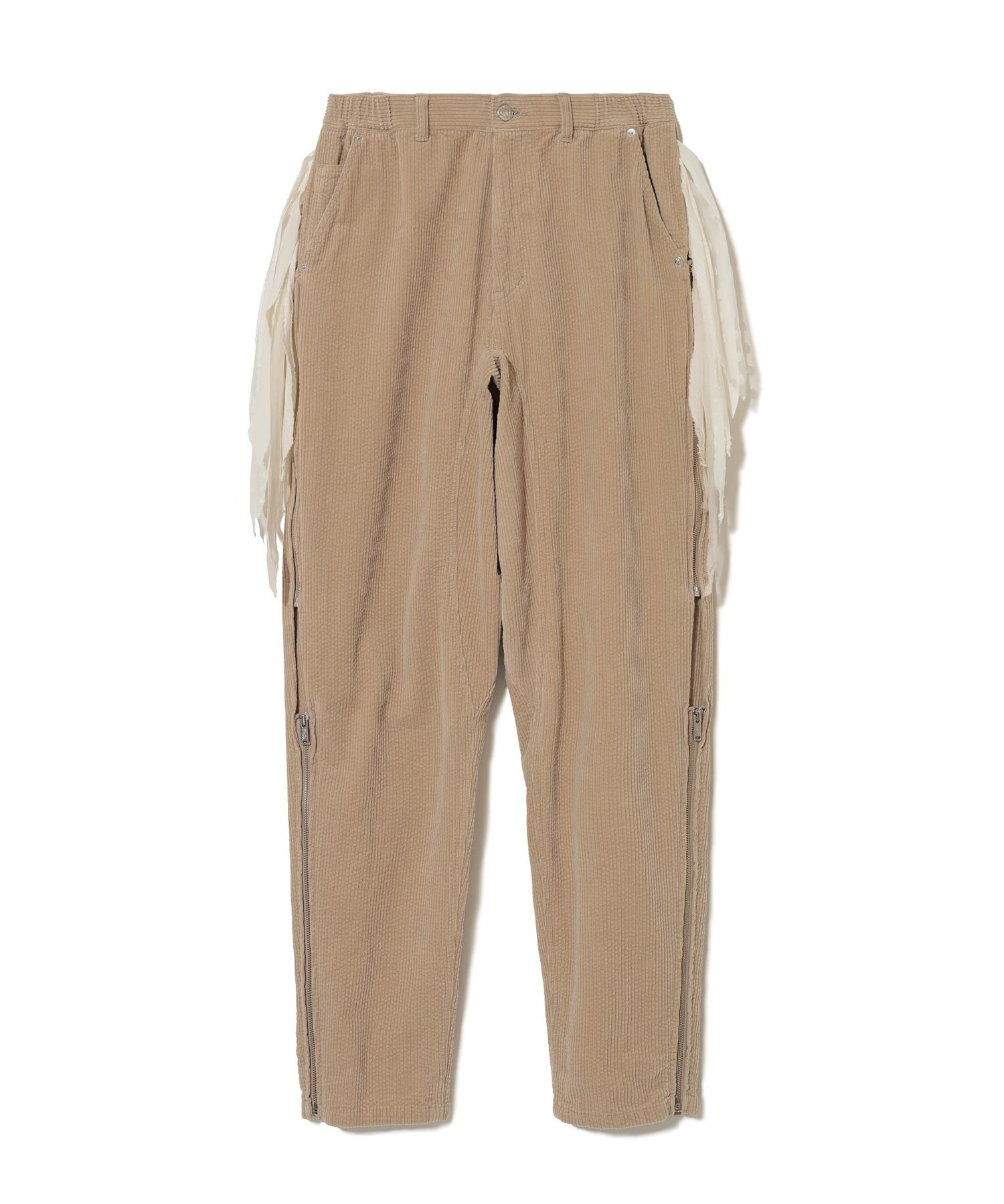 -Cotton corduroy pants -Side zipper -Chiffon fringe on the sides -Elastic waist -Back patch pocket MATERIAL 100% COTTON PARTLY: 75% POLYESTER, 10% COTTON, 10% RAYON 5% LINEN