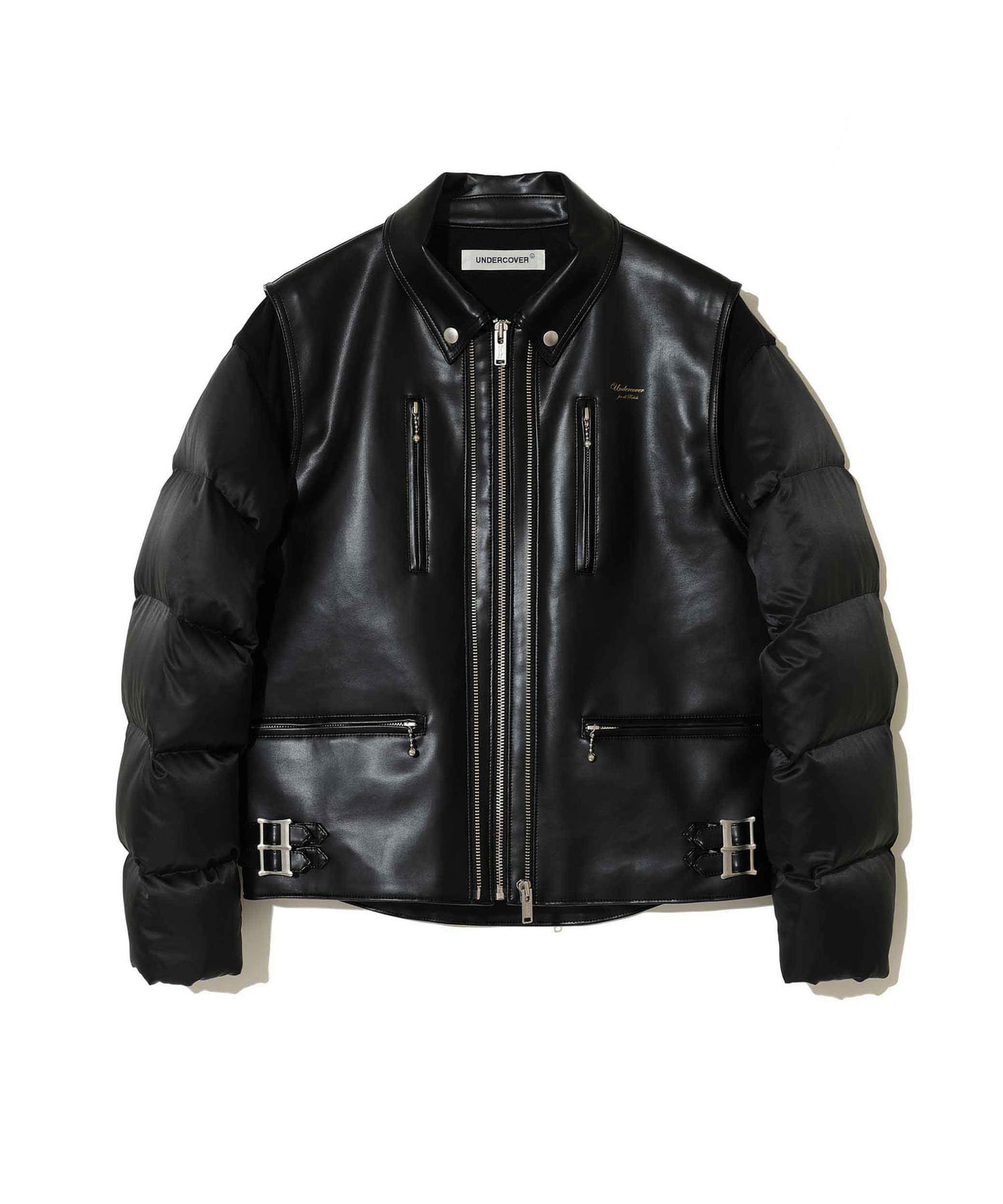 -Down-sleeve faux leather rider jacket -Front zipper pocket, logo print -Side buckles MATERIAL SURFACE1: FACE/100% POLYURETHA N, GROUND/100% COTTON SURFACE2: 100% POLYESTER LINING1: 100% COTTON LINING2: 100% POLYESTER FILLING1: 100% POLYESTER FILLING2: 90% DOWN,10% FEATHER RIB:96% COTTON, 4%POLYURETHAN
