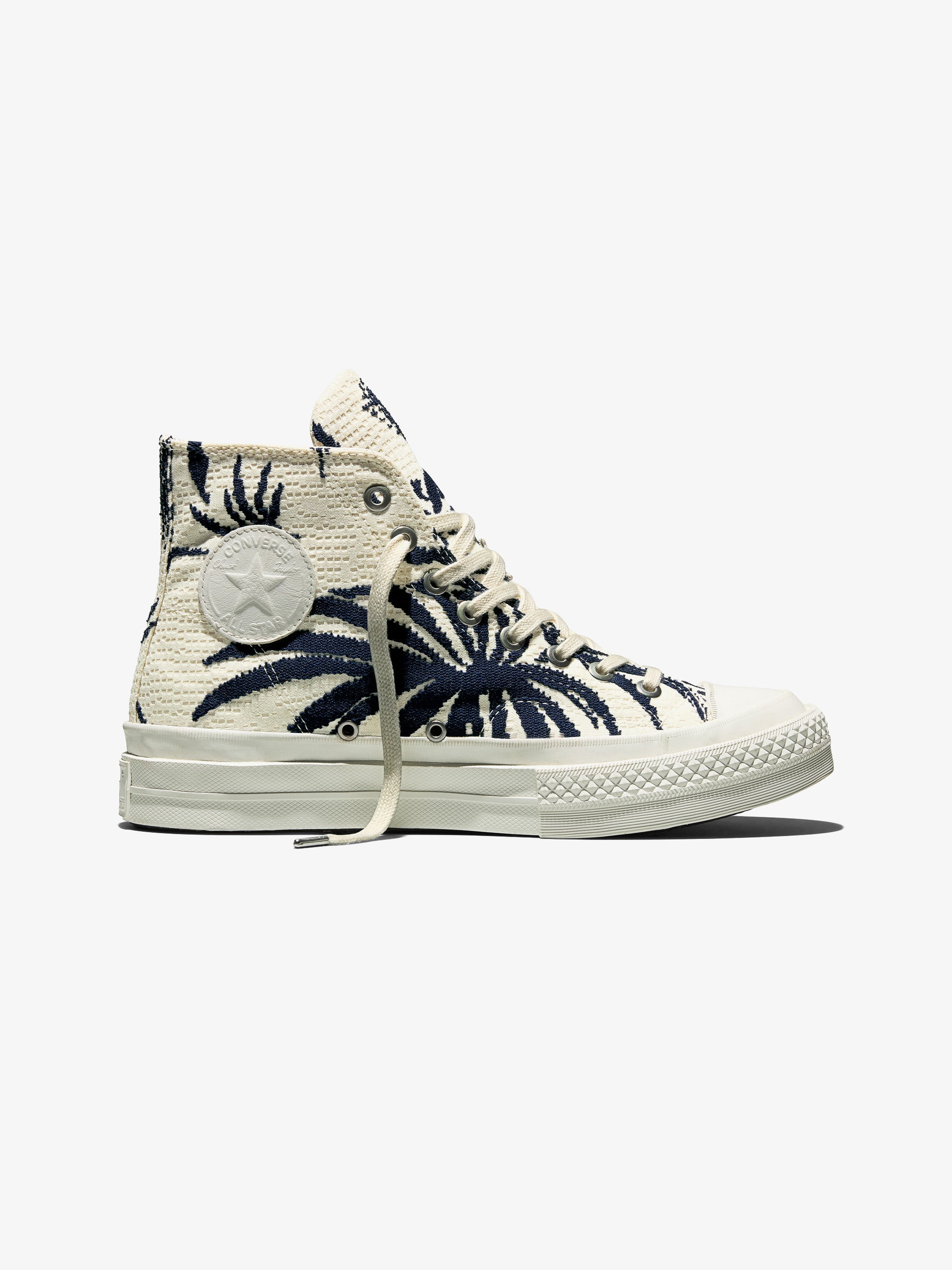 The Chuck gets a premium lift with First String craftsmanship. This pair brings a woven floral pattern to the classic high-top, balancing heritage court energy with elevated detail. The textured upper, tonal laces, and clean rubber midsole keep it raw but refined — perfect for anyone who wants the Converse DNA with a sharper edge. Note: Fits a full size large. We recommend sizing down from your usual Chuck 70 size. SKU: A16750C