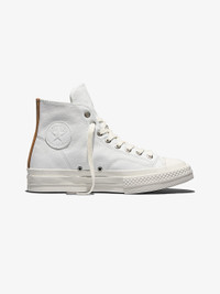 An icon reimagined in leather. This Chuck Taylor First String comes dressed in smooth white with a brown sugar heel tab — a subtle hit that shifts the vibe. Elevated materials, contrast textures, and a timeless silhouette keep the pair both everyday and exceptional. Easy to wear, hard to ignore. Note: Fits a full size large. We recommend sizing down from your usual Chuck 70 size. SKU: A14281C