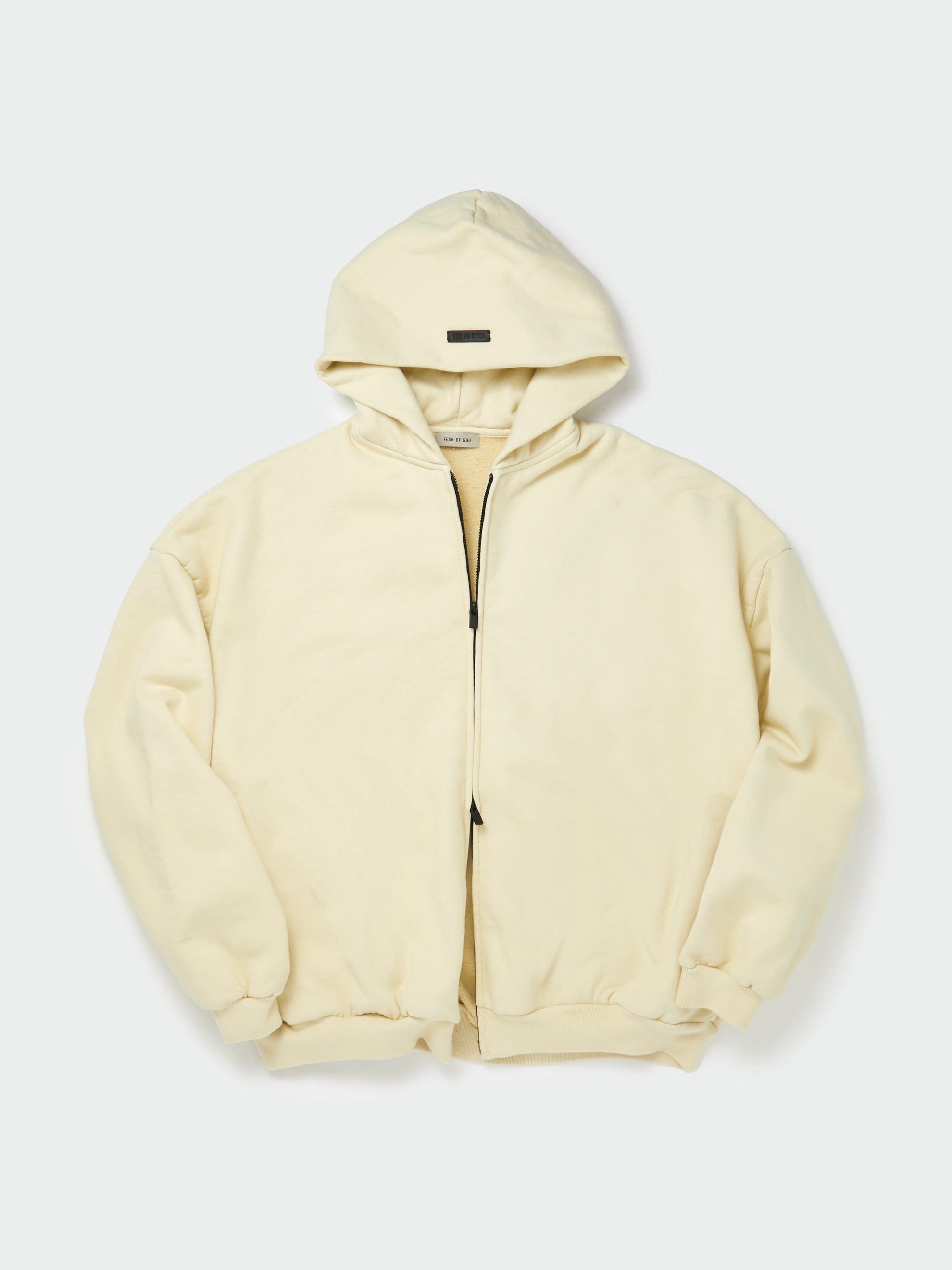 The Full Zip Hoodie is made in the USA from 100% cotton fleece with a vintage wash to contribute depth and softness. The signature Fear of God fit is evident with a relaxed silhouette, dropped shoulders, and a double-layered hood. Additional details include an antique brass zipper front, side pockets, rib-knit cuffs, and waist hem. A leather Fear of God label is stitched on the hood. Model is 6'2 wearing size L