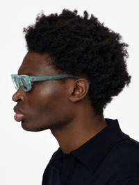 The Whiskeyclone (Piscine) feature The blue cured cellulose acetate frame, custom triple laminated temples, and red lenses provide 100% UV protection. The silver arrowhead and wirecore details add a unique touch, while the mahogany CR39 lenses and anti-reflective treatment ensure clear vision. Trust in the custom 7 barrel hinge and tension-secured design for durable and stylish eyewear.