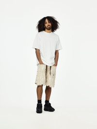 Cut from patterned 12oz denim, these easy shorts balance function and flair with reinforced double knees and raw hems. The relaxed silhouette and deconstructed wash give them a worn-in feel that pairs effortlessly with oversized shirts or light outerwear. Made in Japan. SKU: EK-1721SP
