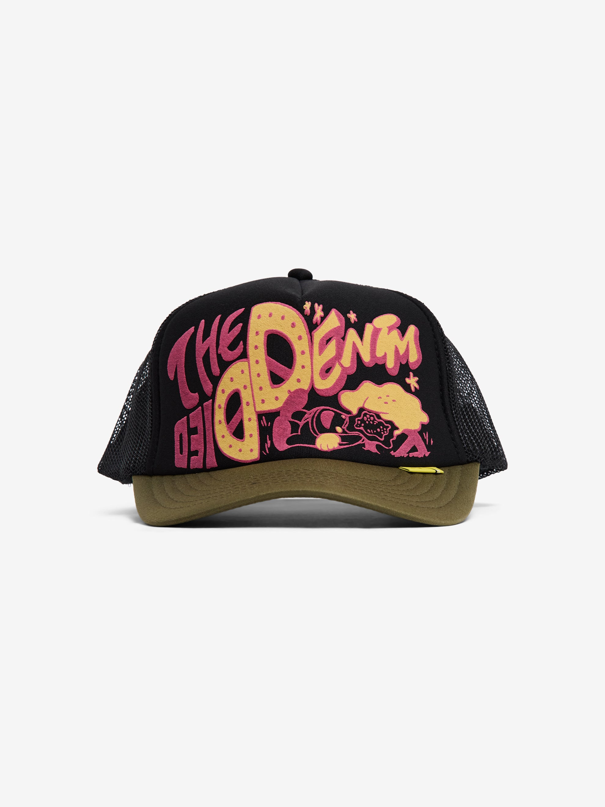 Introducing the Kapital TH.D.D. Track Cap—where Kountry craftsmanship meets street-ready style. This reimagined trucker cap features hand-applied graphics that echo Kapital’s signature aesthetic. Crafted from durable cotton twill with a breathable polyester mesh back, it offers both comfort and structure. The pre-curved bill and adjustable snapback ensure a personalized fit, while the distressed finish adds a touch of vintage character. Whether you're layering it over a track jacket or pairing it with your favorite denim, this cap is the perfect blend of form and function. Elevate your look with Kapital's distinctive flair. SKU: K2506XH547_BKK