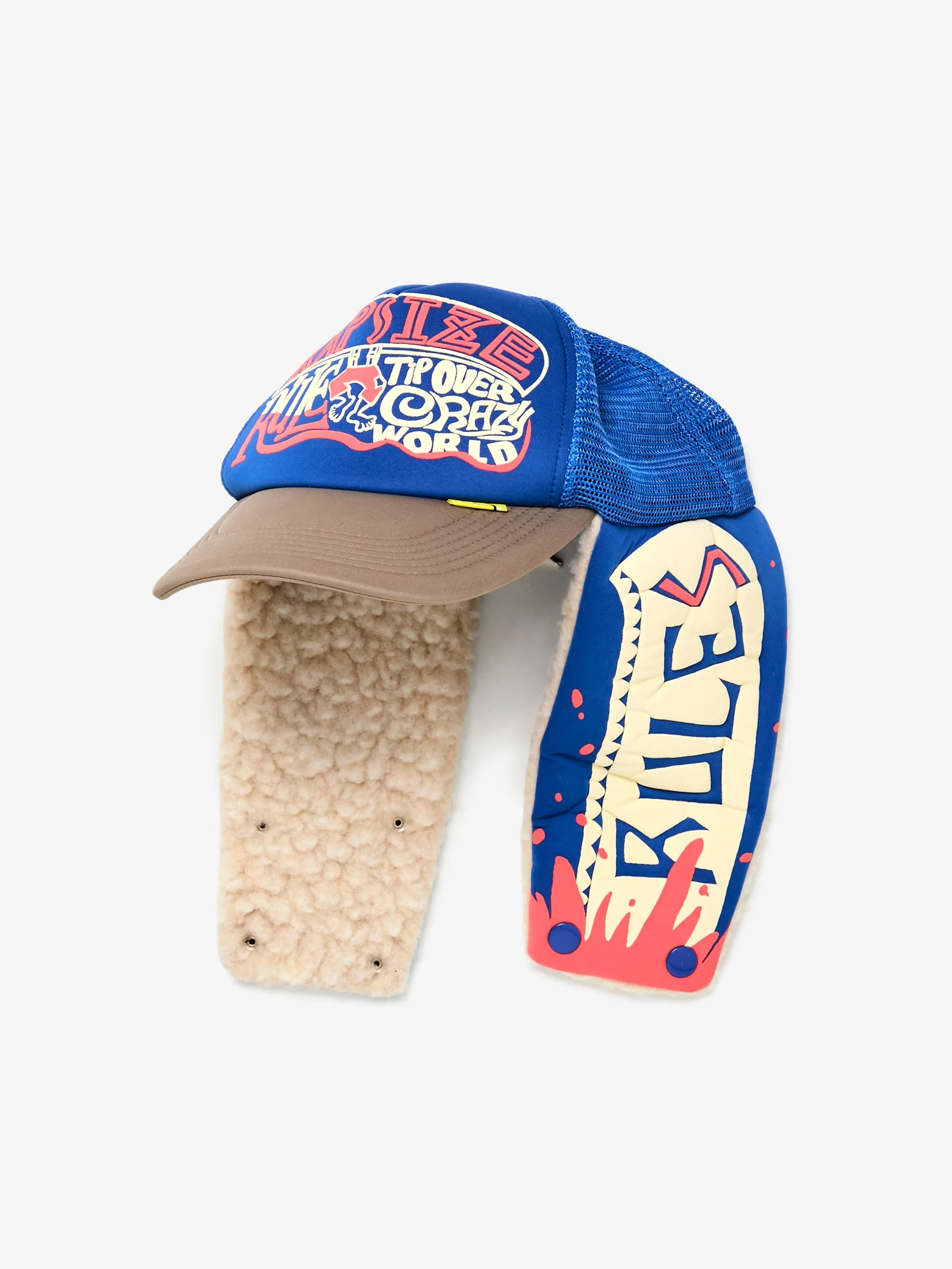 The KAPSIZE RULE LUMBER Trucker Cap delivers KAPITAL’s playful graphic language through a familiar silhouette. Traditional trucker styling meets statement embroidery, balancing humor with everyday function. Lightweight, breathable, and adjustable, it’s designed to finish a look with intention—casual, confident, and unmistakably KAPITAL. SKU: K2511XH549
