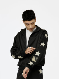 The KAPITAL Smooth Jersey Standman&Woman Track Jacket combines retro athletic style with artisanal detailing. This relaxed-fit track jacket features embroidered star graphics on the sleeves and a woven brand patch for a signature touch. Designed with a stand collar, ribbed cuffs and hem, and welted hand pockets, it offers both comfort and functionality, making it a standout piece with timeless appeal. 100% Polyester Model is 5'11 wearing a size 3 Made in Japan
