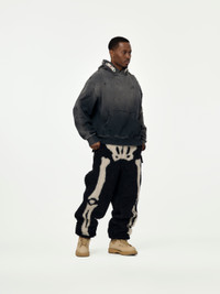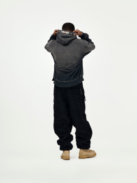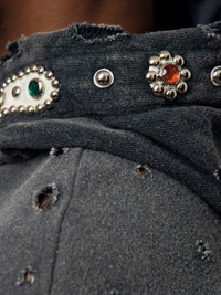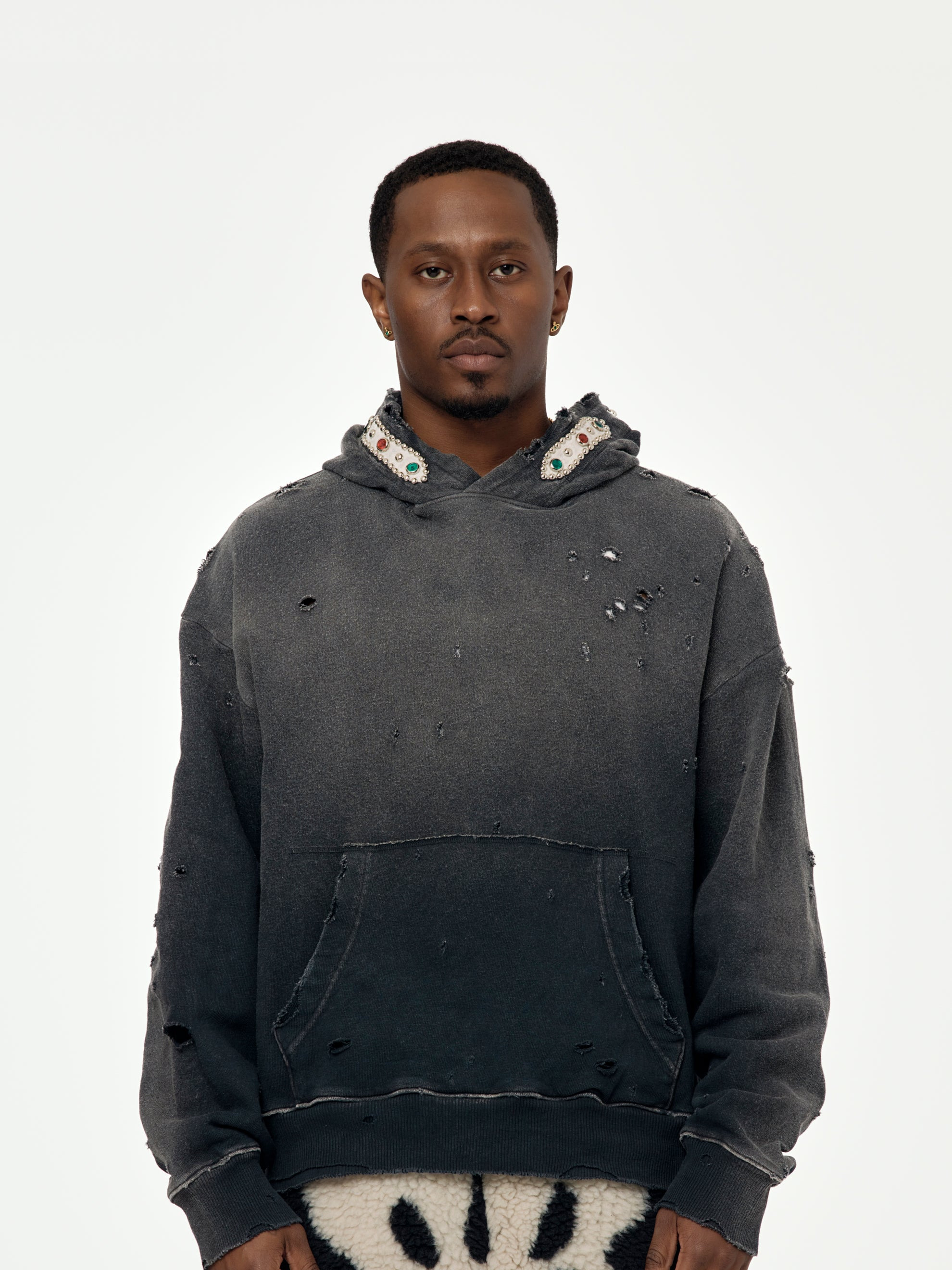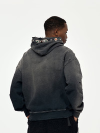 Step up your game with the SWT Knit THRILLER Damaged Hoodie. Made from beautiful brushed cotton-jersey that was washed and distressed for a vintage look and feel, this hoodie is a nod to traditional patterns with its crystal and stud embellishments along the hood. This piece is it. Don't sleep! 100% Cotton Model is 5'9 wearing a size Medium Made in Japan