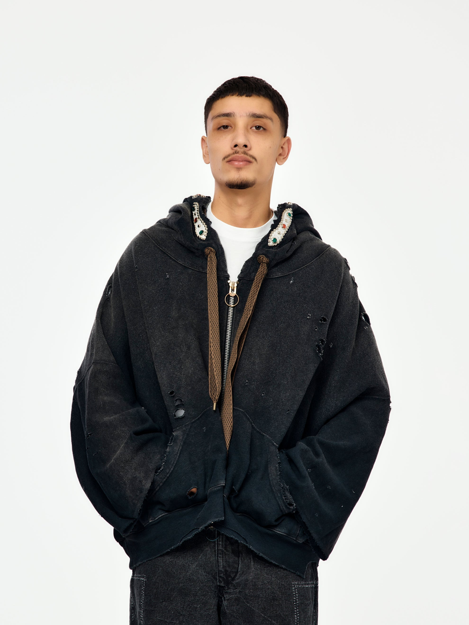 Embelished Distressed Cotton-Jersey Zip-Up Hoodie Black