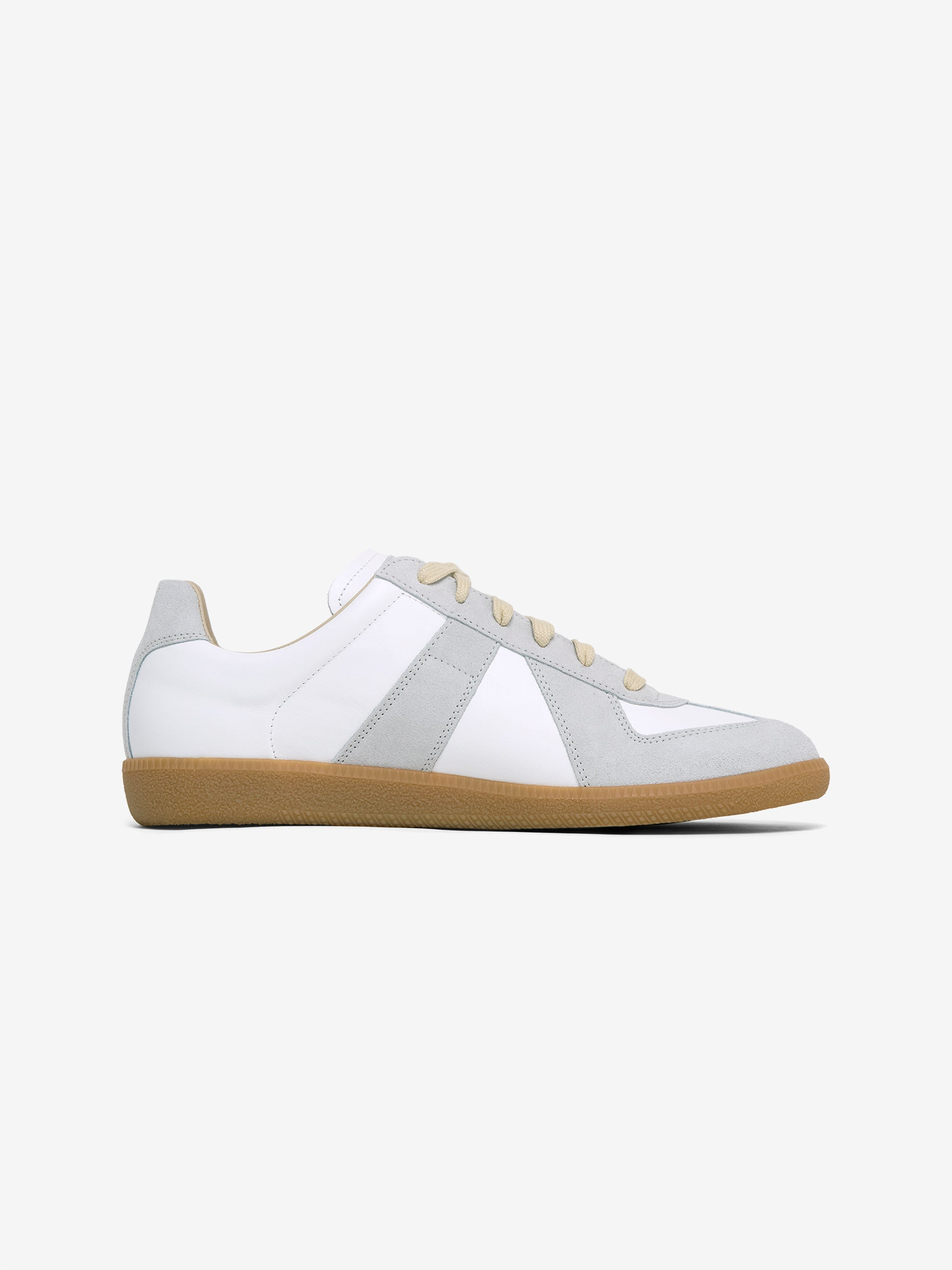 A Margiela icon since ’99, the Replica sneaker takes cues from vintage German Army Trainers and rebuilds them with Maison’s elevated hand. This off-white edition layers smooth leather and supple suede, grounded on a gum sole for timeless wear. Minimal, versatile, and unmistakably Margiela—every step nods to understated luxury. SKU: S57WS0236-P1895-101