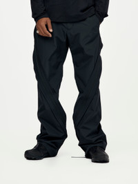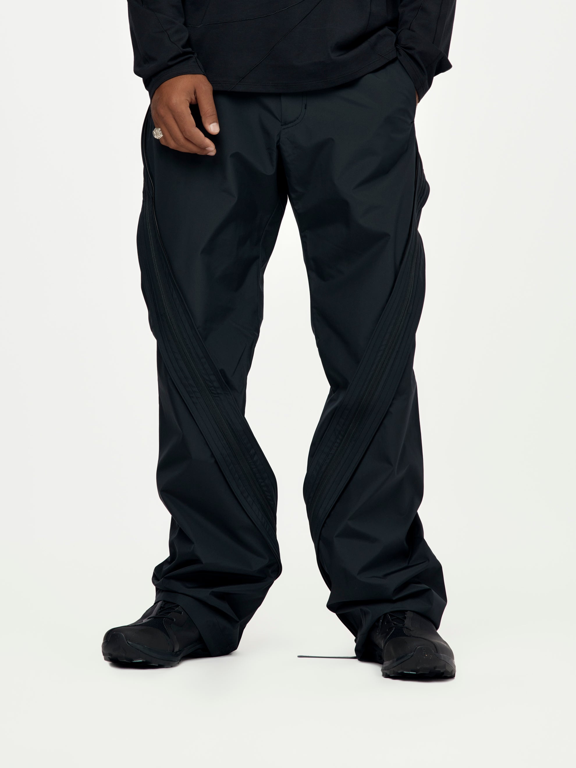 Based on 4.0 TECHNICAL PANTS CENTER, with revised fabric. The 2-way zippers create an asymmetric line design from waist to hem, while offering various styling options by adjusting the size and fit of the garment. South Korean fabric. Membrane coated, water resistant, water repellent, breathable, and lightweight 3-layer ripstop fabric Model is 6'0 wearing a size L.