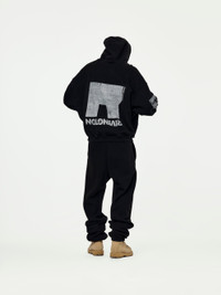 The Heritage CVA Pullover in Jet Black by RRR123 features a unique geometric 'R' logo print, faded for a vintage touch. Made with weighted cotton-jersey, it offers a relaxed and comfortable fit with dropped-shoulder design. 100% Cotton Model is 5'9 wearing a size Medium Made in USA