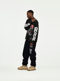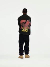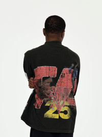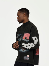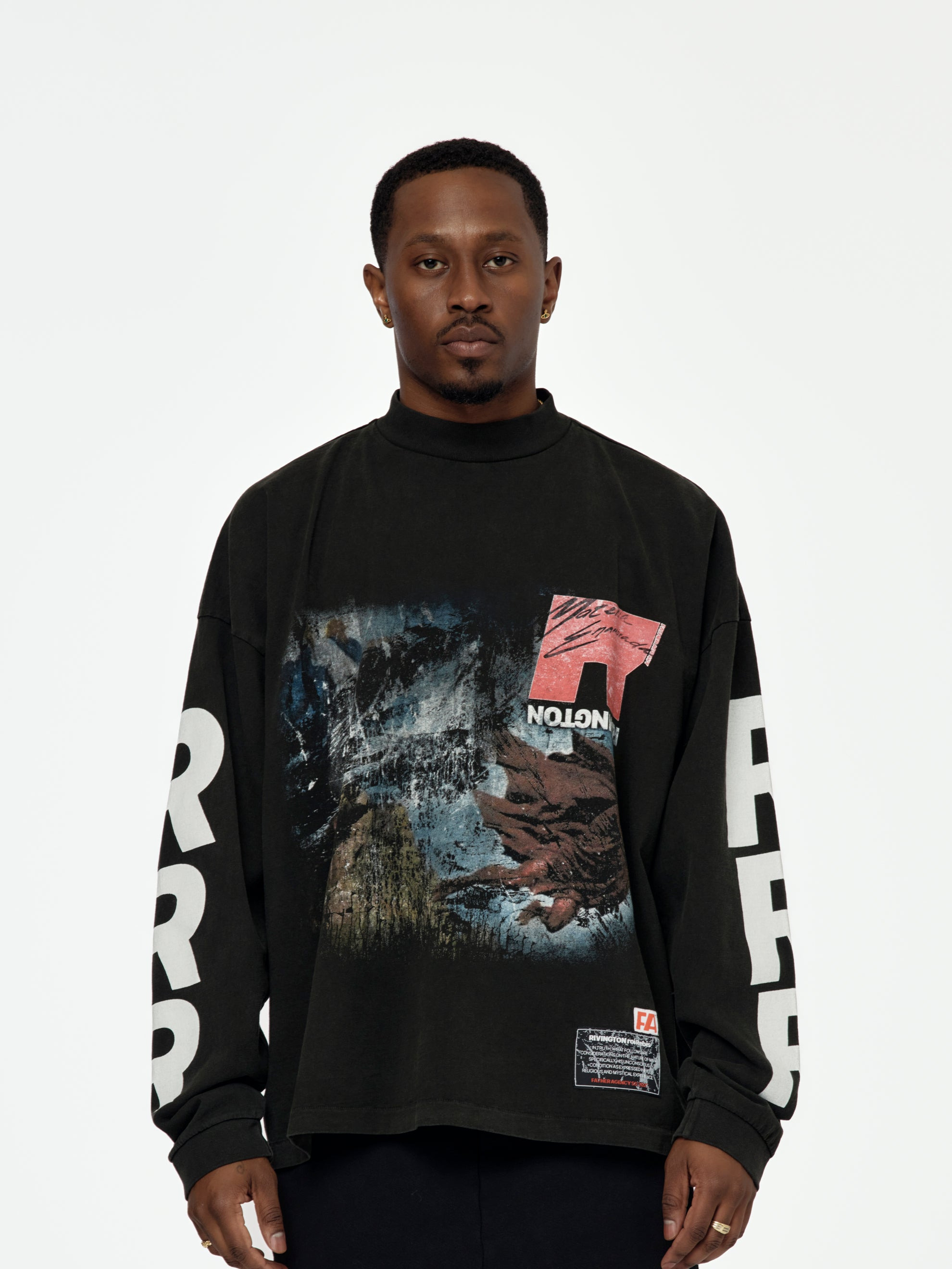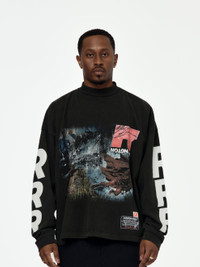 The It Was Written LS Tee. This mechanic black tee features a regular fit, mock neck, and long sleeves. Vintage washed print design on the front and sleeves. 100% Cotton Model is 5'9 wearing a size Medium Made in USA