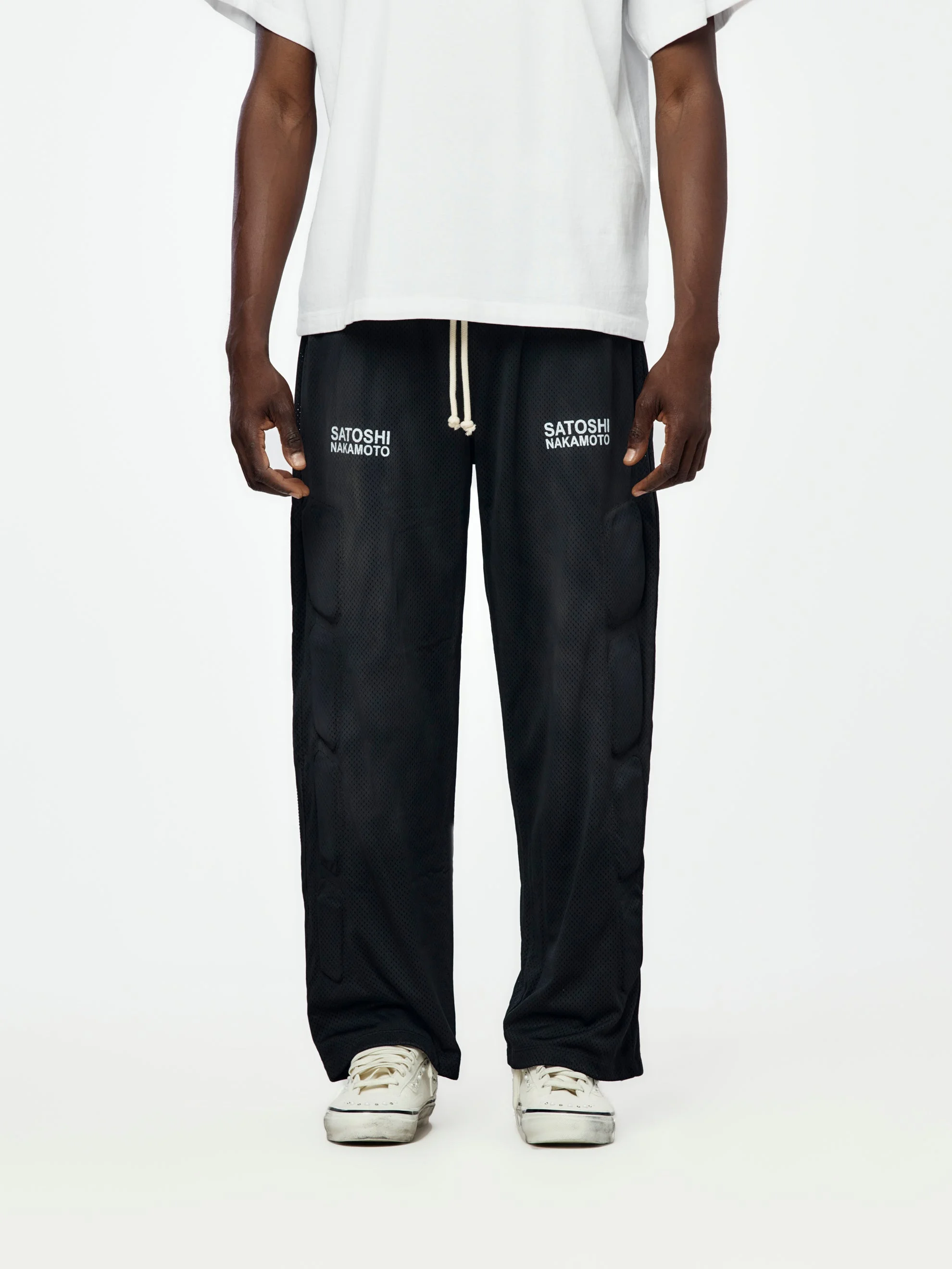 Pulled from moto gear, rebuilt for modern downtime. The Mesh Moto Lounge Pant pairs breathable mesh panels with articulated knee detailing for movement and airflow. Finished with an elastic waist and tapered fit — technical comfort in SATOSHI NAKAMOTO’s signature industrial vocabulary. SKU: FW25PNT006