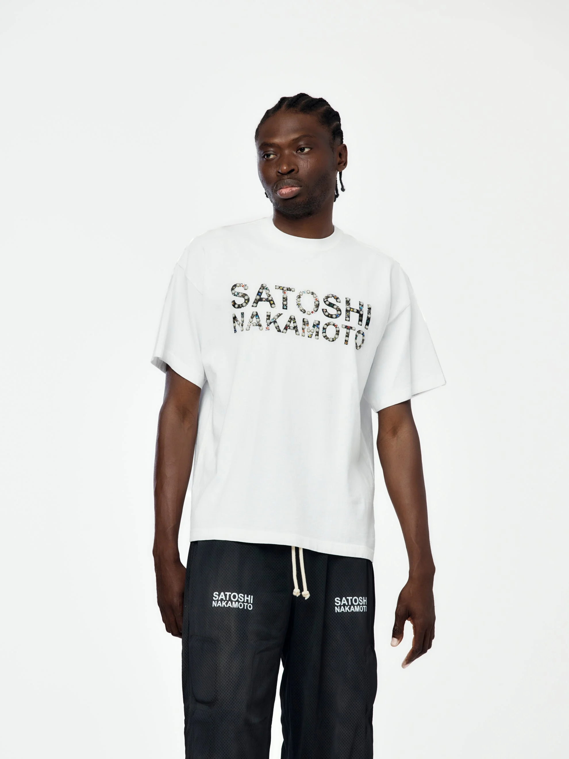 A minimalist base with a maximalist twist. The Pearl Studded Logo Tee elevates the SATOSHI NAKAMOTO wordmark with hand-applied pearl studs — a sharp, unexpected contrast against crisp white cotton. Clean, sculptural, and built to stand out. SKU: FW25TEE019
