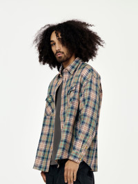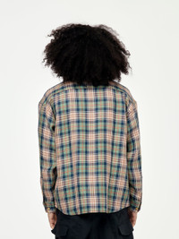 This LUMBER CHECK L/S (Navy) shirt offers a perfect blend of style and comfort. Made with a beautifully textured woven wool/linen fabric, it features a pressed finish for a polished look. The custom water buffalo buttons add a touch of uniqueness to this flannel check shirt. Model is 5'10 wearing a size L. 100% Wool -Made in Japan