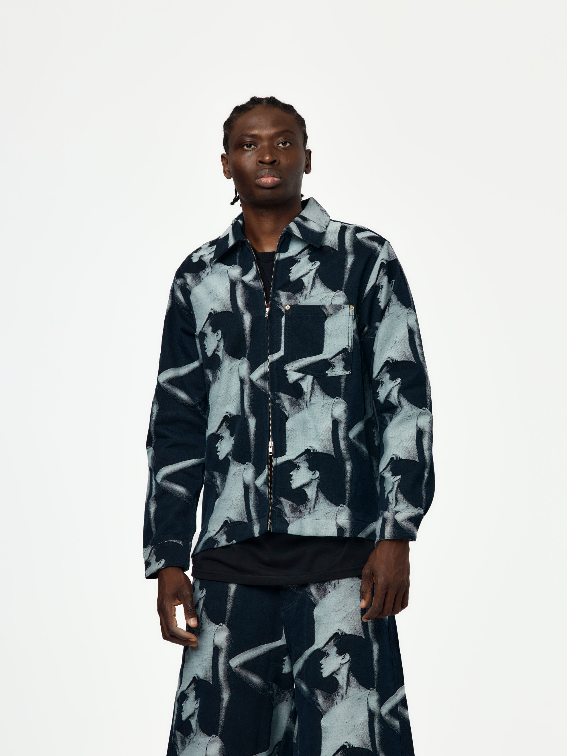A denim zip-up jacket built in the same jacquard weave as the Jet Shorts. Features a wide collar, cropped length, and tonal contrast. Archival soul meets contemporary surface. SKU: UA25DE02-CO02-504