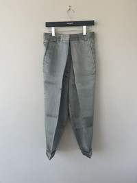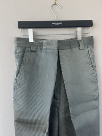The origami trousers from Haider, with overlapped pleated panels that hook together at the center of the waist, in a silver and black striped silk fabric. Tagged 36, fit men’s 28-30. In used condition with general wear. Feel free to message me with any questions or an offer. Thank you!