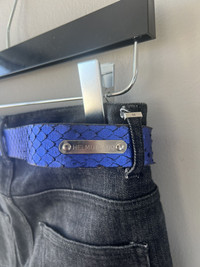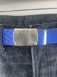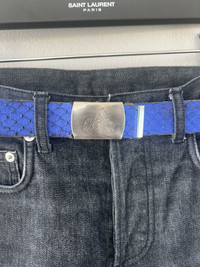 A belt from Lang’s SS1993 collection in an Irridescent blue snakeskin, with a buckle engraved with the catholic imagery that was the seasons distinctive motif. Tagged 40, fits like a 28. In used condition with general wear. Feel free to message me with any questions or an offer. Thank you!