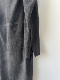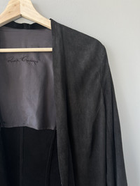 An incredible leather coat from Rick from the 2000s, in a soft brown goat suede. My friend called this one “Rick does Margiela’s Hermes.” The coat is unstructured and almost feels like a robe, with uneven raw finished edges and no collar. Really incredible piece from early Rick. Tagged a 44, fits a women’s M or men’s XS. In used condition with general wear. Feel free to message me with any questions or an offer. Thank you!