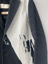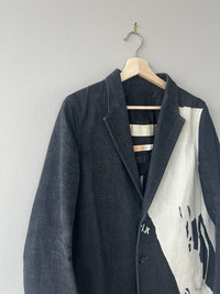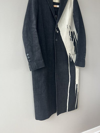 The iconic coat from Rick's Fall 2016 collection, entitled Mastodon. This is one of the best variations of the Moreau coat which Rick has done for a few years now, composed of a medium-weight denim fabric that has been splattered with a thickened bleach solution to create the unique vomit splash pattern. Because of this production technique, each piece produced with the vomit splash treatment has its own bleached pattern, making each coat unique. A true grail from one of Rick's best collections. Tagged a size 48, fits TTS for intended fit or true 46 for a looser fit. In used condition with general wear. Feel free to message me with any questions or an offer. Thank you!