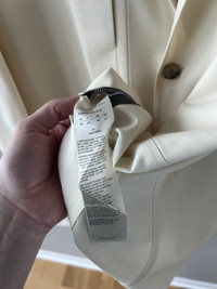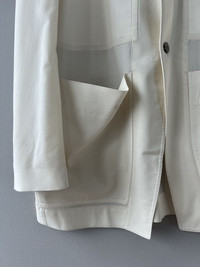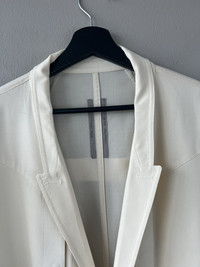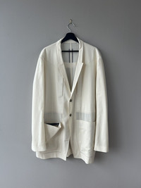 Unstructured blazer from Rick’s SS22 collection in the off-white shade “Natural,” with a skinny peak lapel, zippered patch pockets, and a slight cutaway front. Tagged a 56, fit TTS. In used condition with general wear. Feel free to message me with any questions or an offer. Thank you!