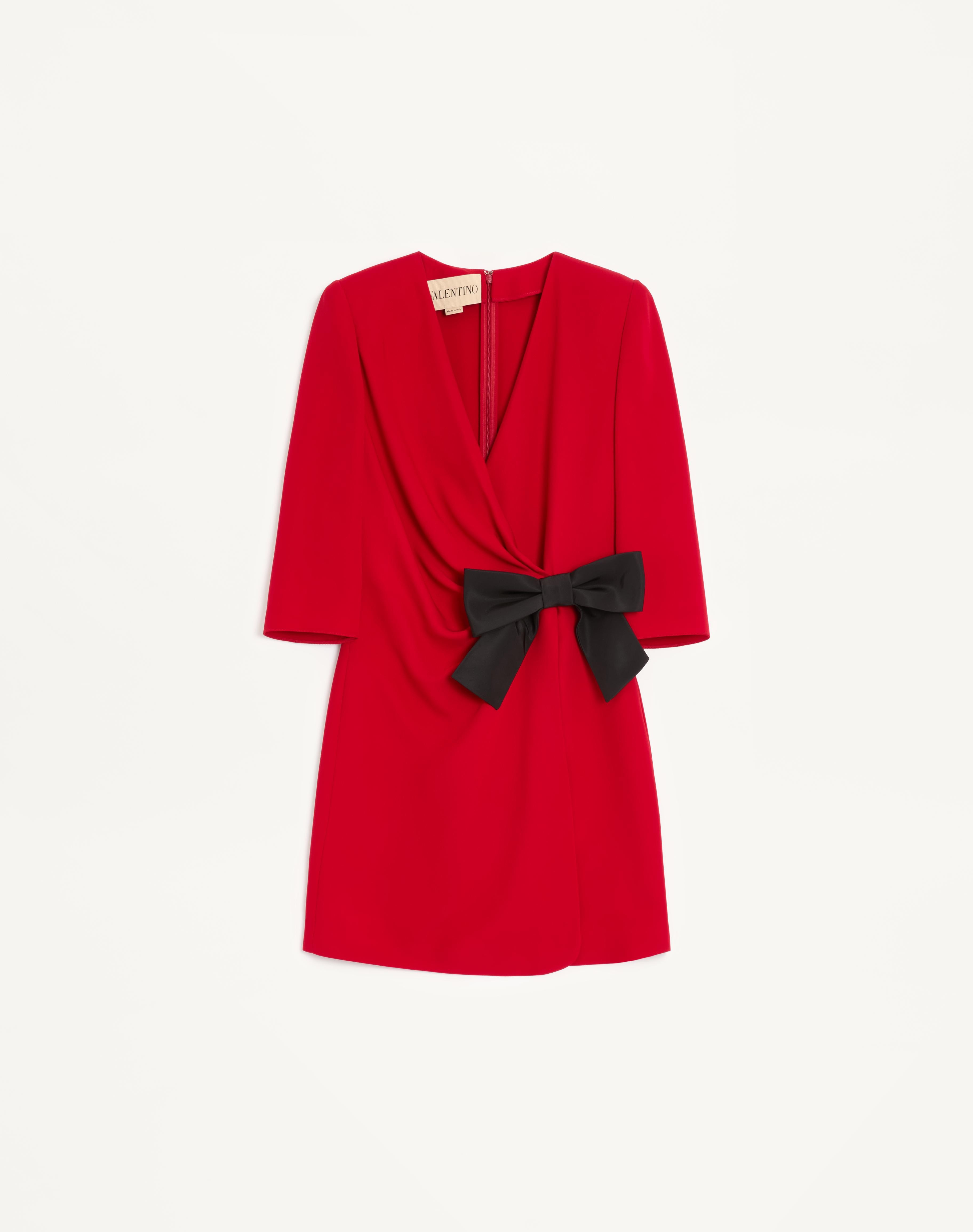 Cady Couture short dress with Faille bow - Ruching detail at the waist - Back zipper and hook-and-eye closure - Cady Couture (100% Silk) - Georgette Stretch Viscose lining (91% Viscose, 9% Elastane) - Length: 90 cm / 35.4 in. from the shoulders in an Italian size 40 - The model is 176 cm / 5'9" tall and wears an Italian size 40 - Made in Italy The look of the model is completed by Valentino Garavani Fetishique Shoes. Product code: 7B0VAGG71MM_9QK