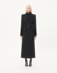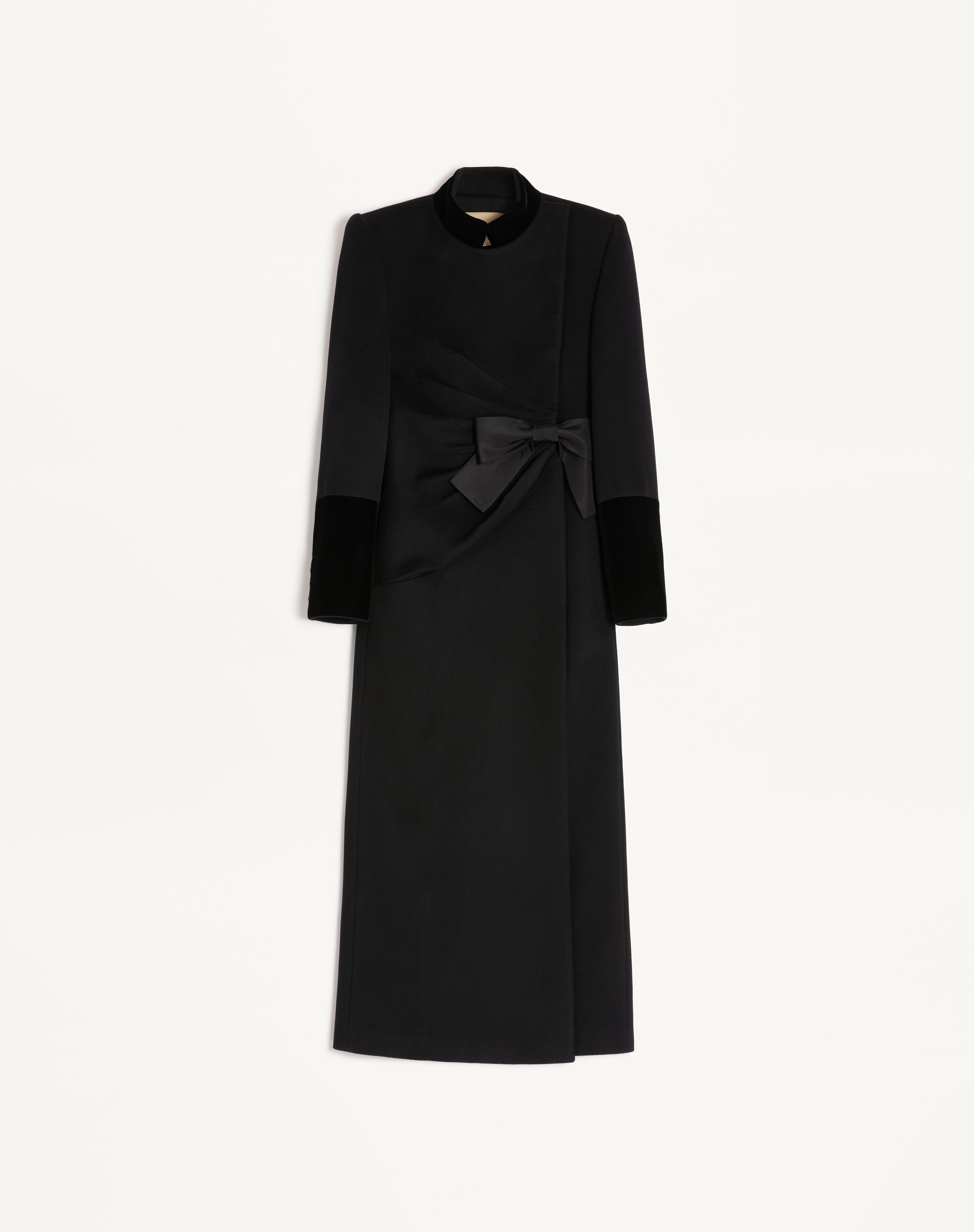 Compact Drap coat with Faille bow - Velvet details - Ruching detail - Shoulder pads - Front closure with snap buttons - Compact Drap (90% Virgin Wool, 10% Cashmere - Flower, Stripes and VLogo lining (74% Acetate, 26% Silk) - Length: 140 cm / 55.1 in. from the shoulders in an Italian size 40 - The model is 176 cm / 5'9" tall and wears an Italian size 40 - Made in Italy The look of the model is completed by Valentino Garavani Dans Le Foyer Shoes. Product code: 7B0CA8056JA_0NO