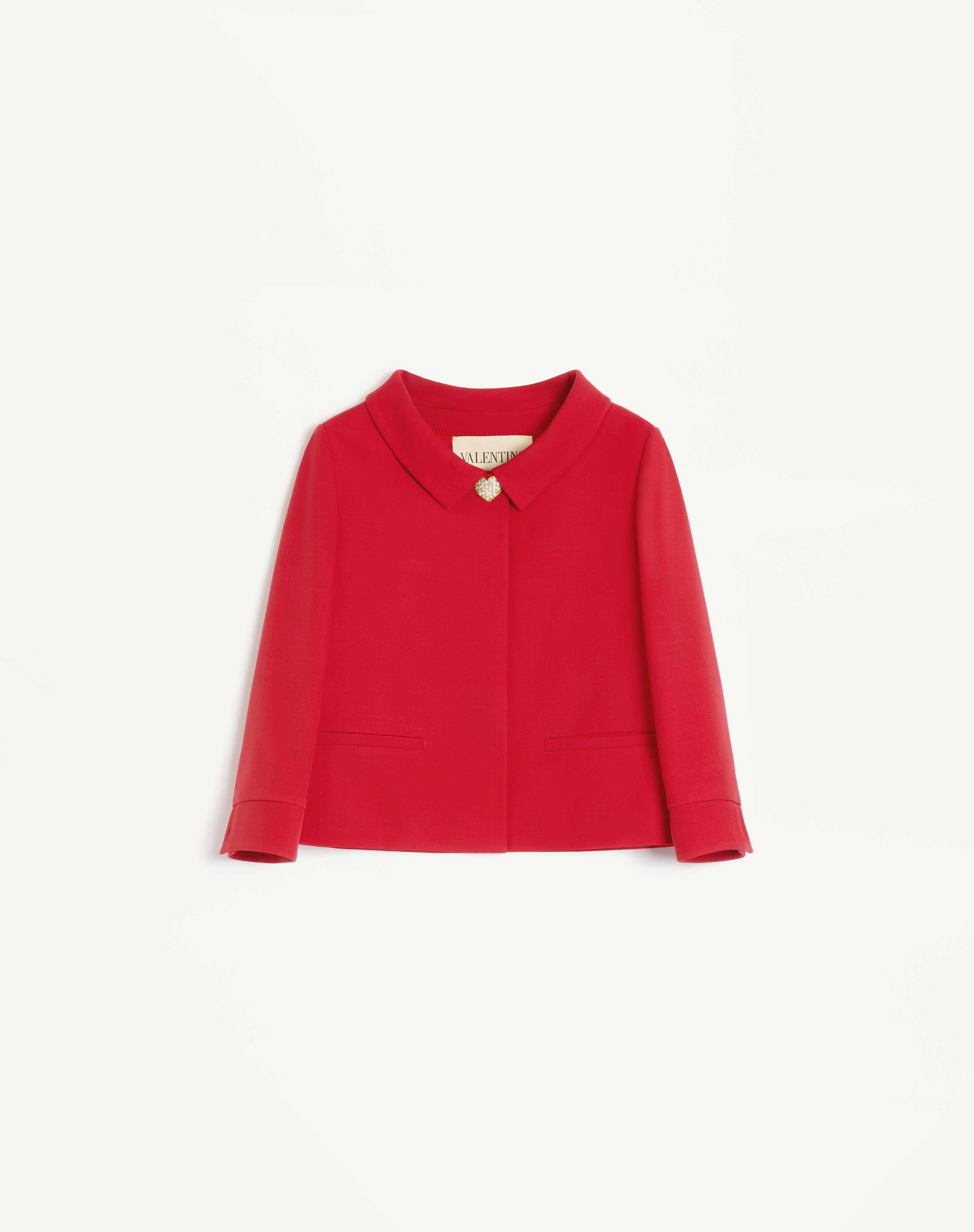 Crepe Couture jacket - Jewel button detail - Front closure with lined press studs - Crepe Couture (65% Virgin Wool, 35% Silk) - Viscose lining (100% Viscose) - Length: 51 cm / 20.1 in. from the shoulders in an Italian size 40 - Sleeve length: 70 cm / 27.6 in. from the center back in an Italian size 40 - The model is 176 cm / 5'9" tall and wears an Italian size 40 - Made in Italy The look of the model is completed by a Valentino Garavani Viva Superstar Bag and Valentino Garavani Adamantine Shoes. Product code: 7B3CE3Y01CF_R9M