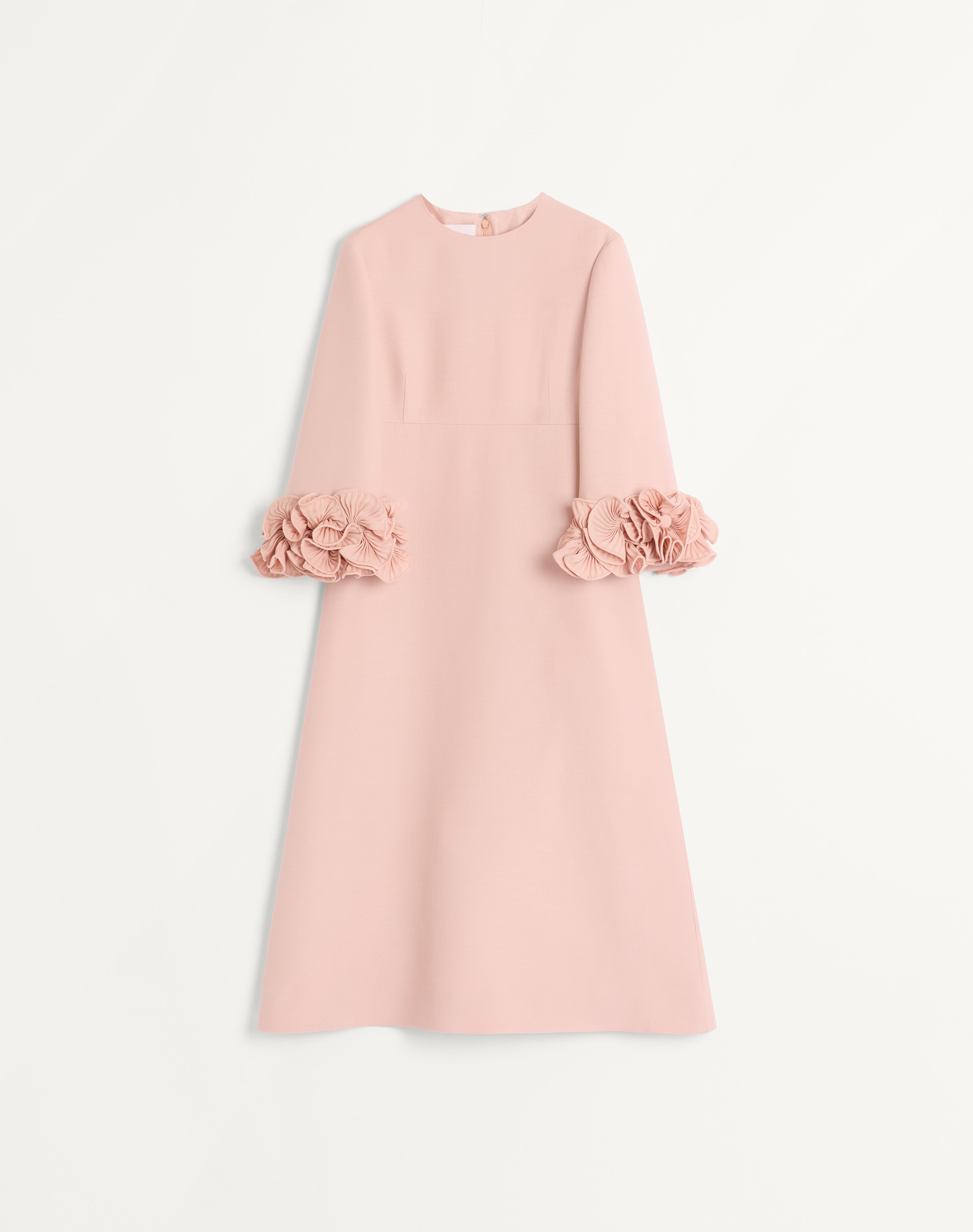 Crepe Couture midi dress with pleated ruffles in Georgette - Rear zipper closure - Crepe Couture (65% Virgin Wool, 35% Silk) - Habotai lining (100% Silk) - Length: 120 cm / 47.2 in. from the shoulders in an Italian size 40 - The model is 176 cm / 5'9" tall and wears an Italian size 40 - Made in Italy The look of the model is completed by a Valentino Garavani Bag and Valentino Garavani Hi Dolly Shoes. Product code: 7B3VAEU81CF_0LZ