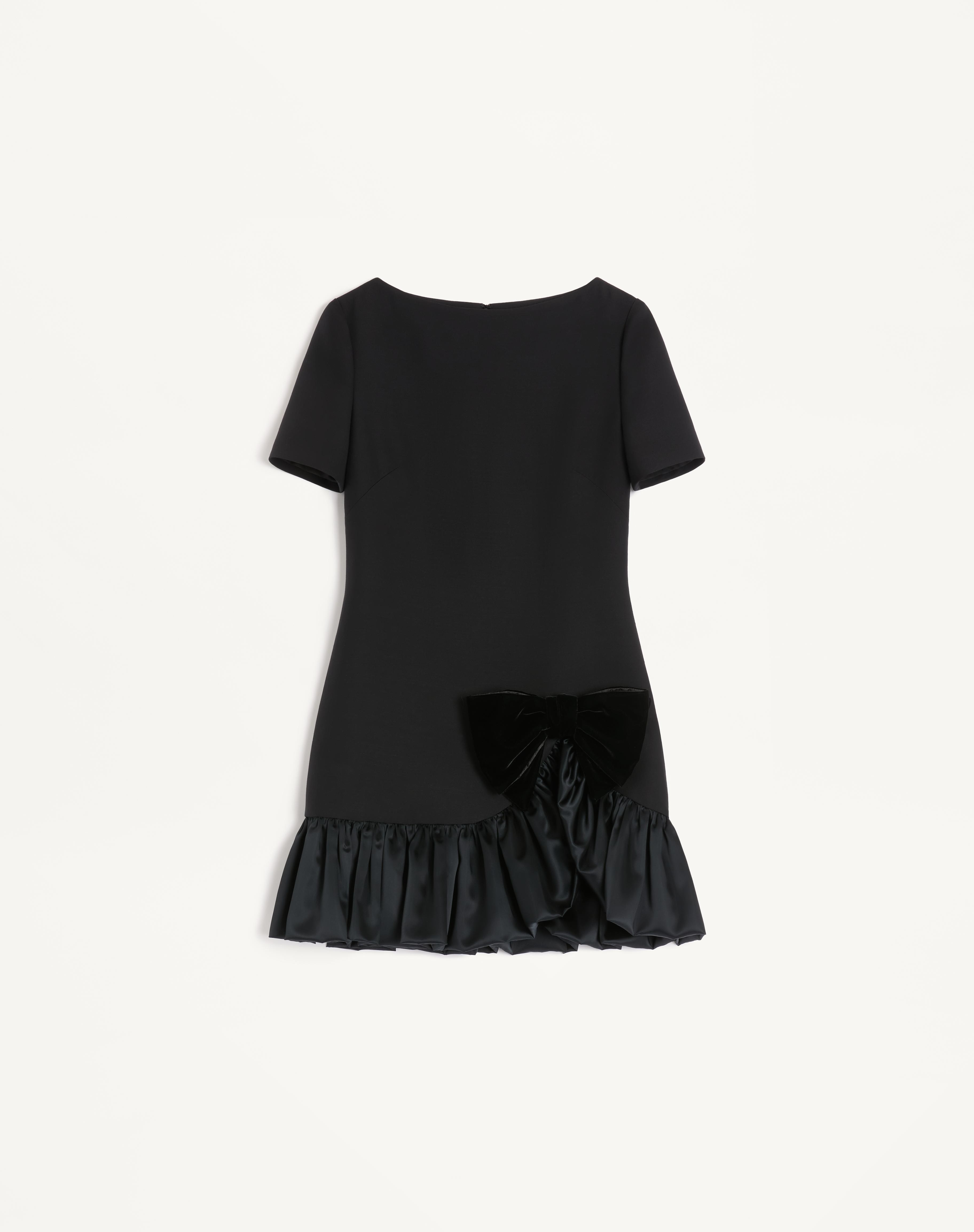 Crepe Couture short dress with ruffle at the bottom in Satin - Velvet bow detail - Boat neckline - Rear zipper closure - Crepe Couture (65% Virgin Wool, 35% Silk) - Habotai lining (100% Silk) - Length: 90 cm / 35.4 in. from the shoulders in an Italian size 40 - The model is 176 cm / 5'9" tall and wears an Italian size 40 - Made in Italy The look of the model is completed by a Valentino Garavani Vain Bag and Valentino Garavani Dans Le Foyer Shoes. Product code: 7B0VAGF81CF_0NO