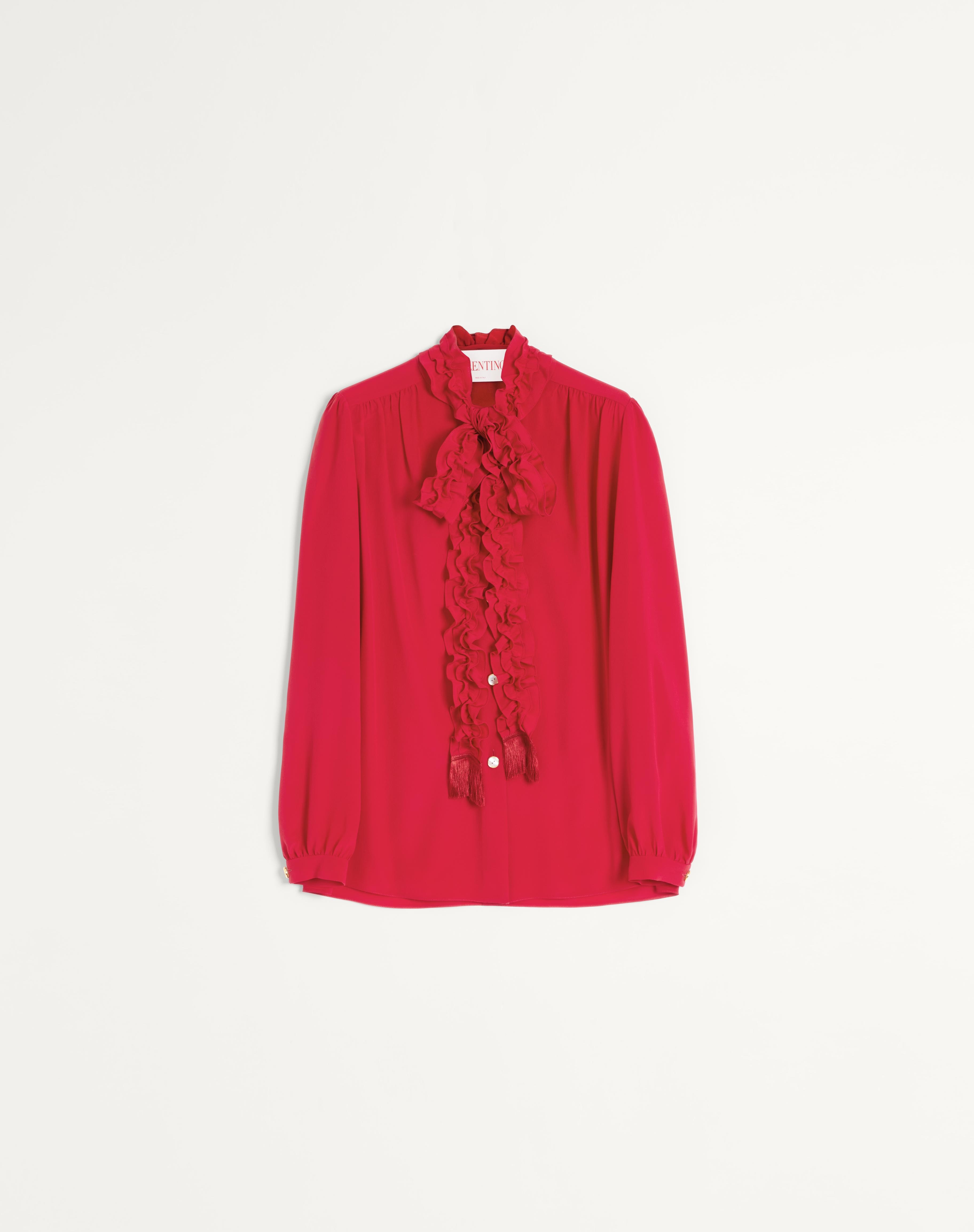 Crepe De Chine long-sleeved shirt - Bow detail with ruffles at the neck - Front button fastening - Crepe de Chine (100% Silk) - Unlined - Length: 70 cm / 27.6 in. from the shoulders in an Italian size 40 - Sleeve length: 83 cm / 32.7 in. from the center back in an Italian size 40 - The model is 176 cm / 5'9" tall and wears an Italian size 40 - Made in Italy The look of the model is completed by a Valentino Garavani Viva Superstar Bag and Valentino Garavani Bowow Shoes. Product code: 6B3AB77590F_R9M