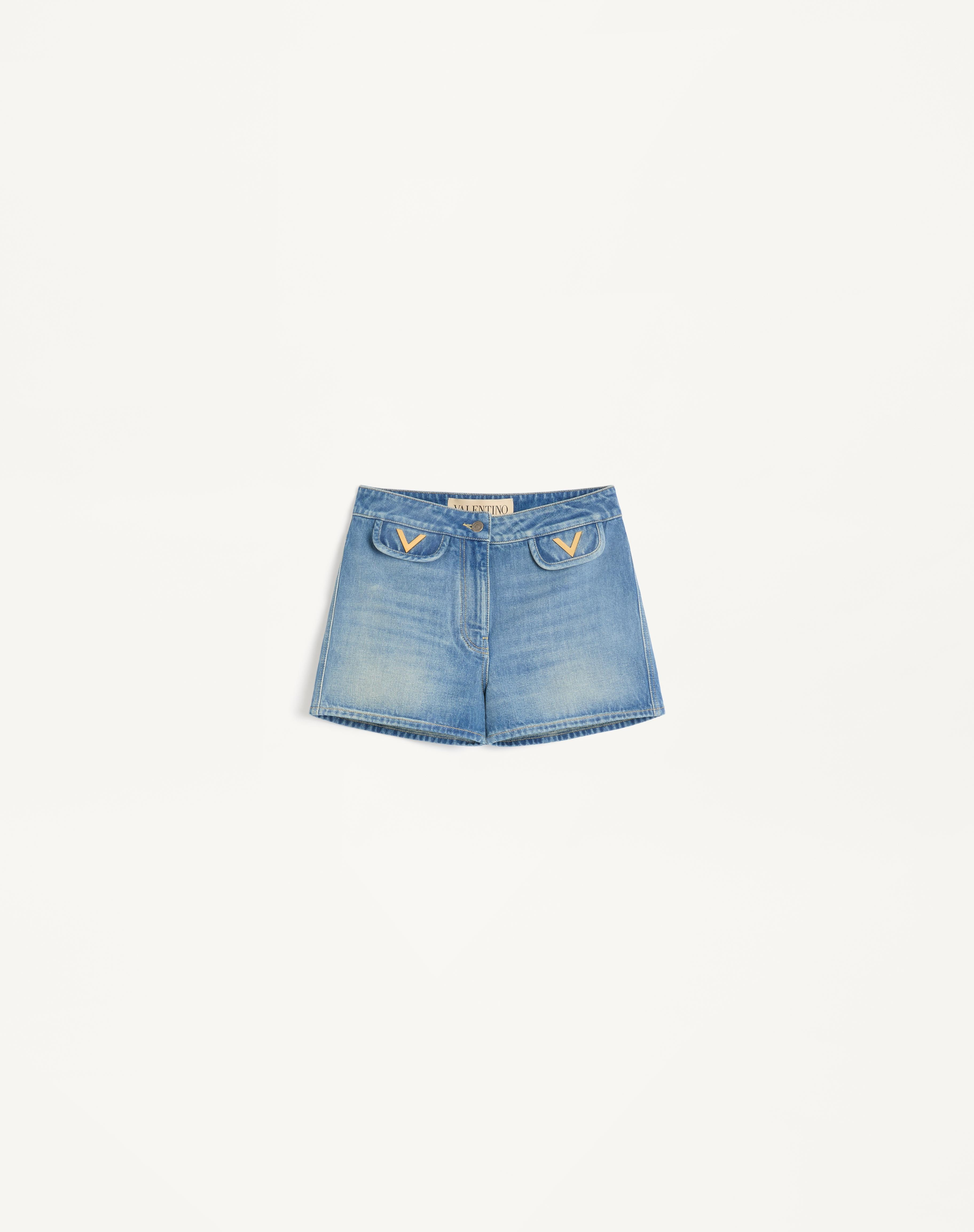 Denim Shorts with V Gold - Front button and zipper closure - Medium Blue Denim (100% Cotton) - Length: 28.5 cm / 11.2 in. from the waist in an Italian size 40 - The model is 176 cm / 5'9" tall and wears an Italian size 40 - Made in Italy The look of the model is completed by a Valentino Garavani Nellcote Bag and Valentino Garavani Fawcette Shoes. Product code: 7B3DD20R9HC_558