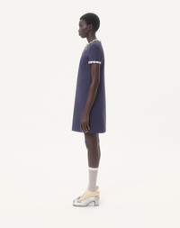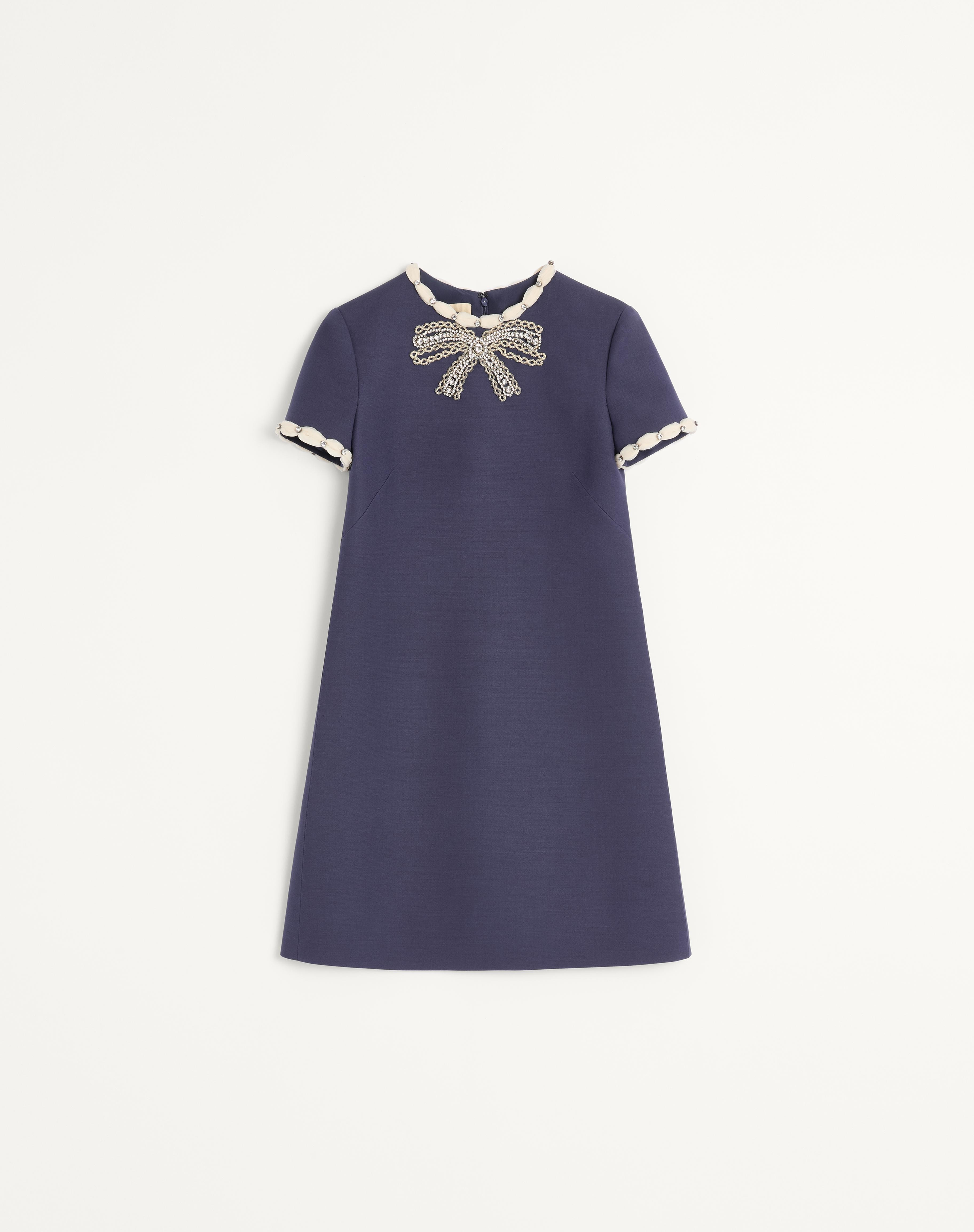 Crepe Couture short dress with embroidered bow - Embroidered trim detail on neckline and sleeves - Rear zipper closure - Crepe Couture (65% Virgin Wool, 35% Silk) - Habotai lining (100% Silk) - Length: 90 cm / 35.4 in. from the shoulders in an Italian size 40 - The model is 176 cm / 5'9" tall and wears an Italian size 40 - Made in Italy The look of the model is completed by a Valentino Garavani Vain Bag and Valentino Garavani Adamantine Shoes. Product code: 7B3VADR91CF_Z61