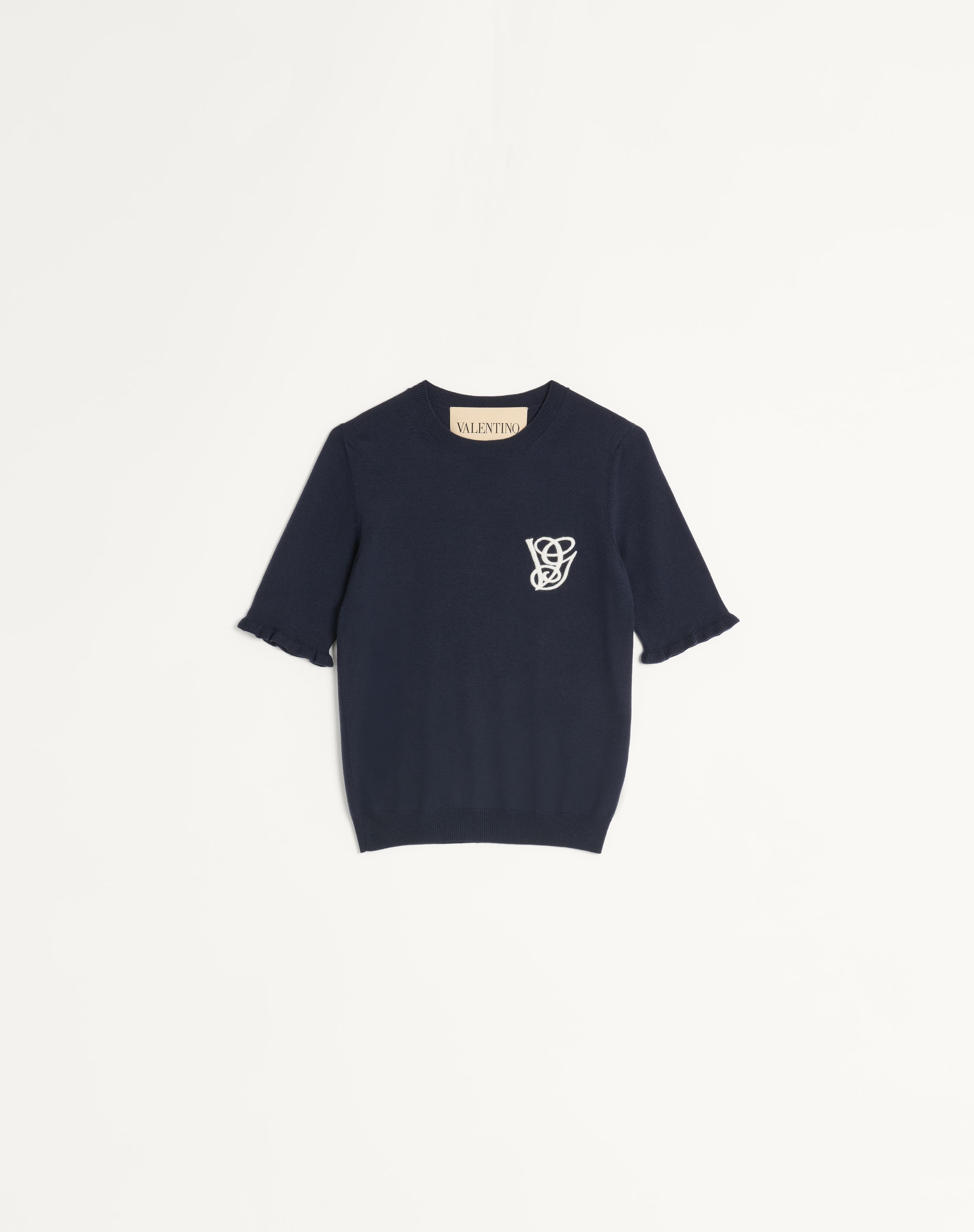 Wool Top with VG Embroidery - Ruffle Detail - Wool (100% Virgin Wool) - Length: 55 cm / 21.6 in. from the shoulders in an Italian size S - The model is 176 cm / 5'9" tall and wears an Italian size S - Made in Italy The look of the model is completed by a Valentino Garavani 9TO5 Bag and Valentino Garavani Adamantine Shoes. Product code: 7B3KC66H9HF_BBE