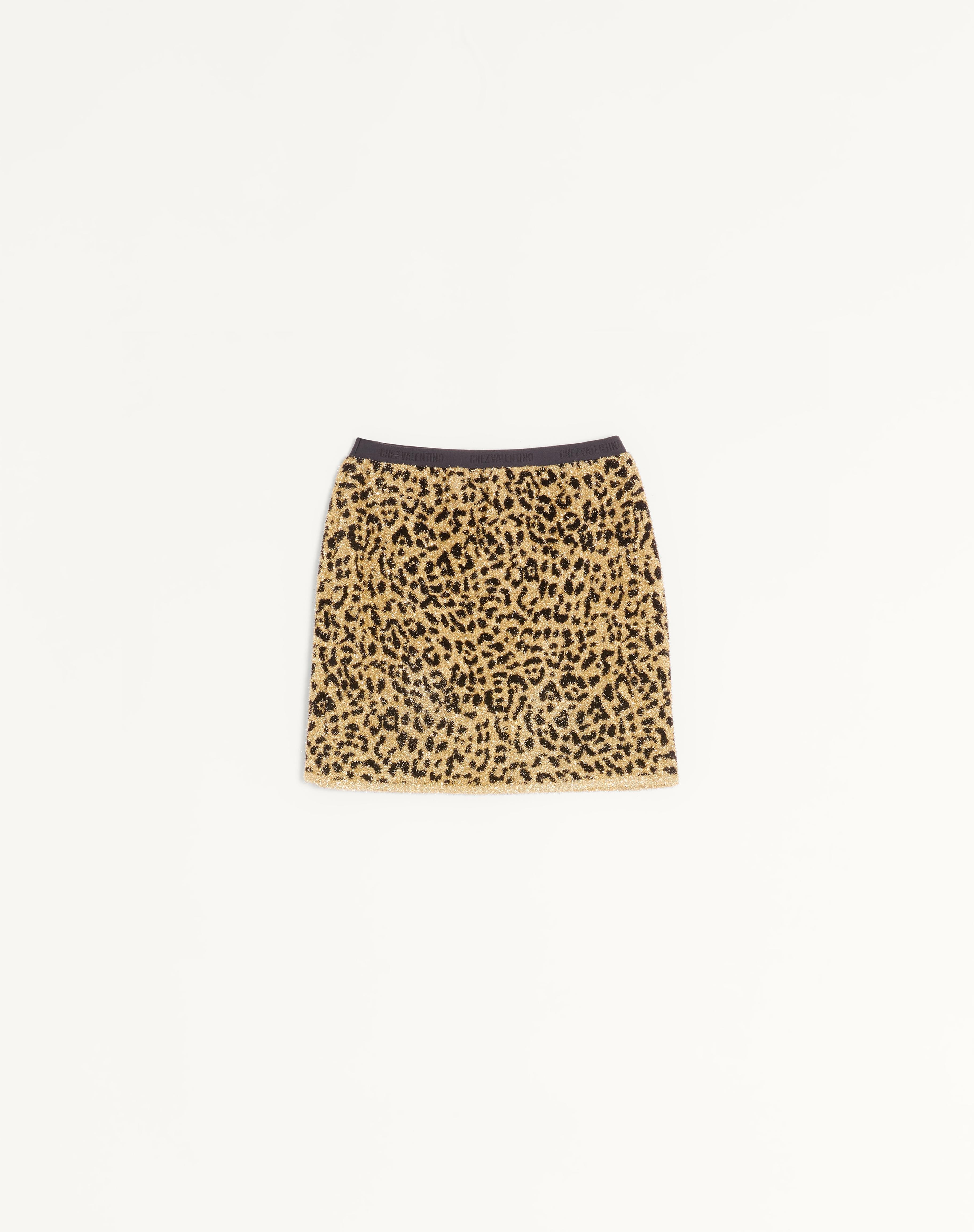 Jacquard animal print Lurex knit skirt - Chez Valentino elastic detail - Jacquard animal print Lurex and Chenille (39% Polyamide, 31% Metallic Fiber, 30% Viscose) - Length: 43 cm / 16.9 in. from the waist in an Italian size S - The model is 176 cm / 5'9" tall and wears an Italian size S - Made in Italy The look of the model is completed by a Valentino Garavani Panthea Bag and Valentino Garavani Drip Rose Shoes. Product code: 7B0KG05S9SM_CCQ