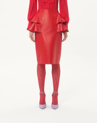 Leather midi skirt with side ruffles - Rear zipper closure - Leather (100% Lambskin) - Jacquard Flower VLogo Lining (75% Acetate, 25% Silk) - Length: 65.5 cm / 25.8 in. from the waist in an Italian size 40 - The model is 176 cm / 5'9" tall and wears an Italian size 40 - Made in Italy The look of the model is completed by a Valentino Garavani Viva Superstar Bag and Valentino Garavani Hi Dolly Shoes. Product code: 7B3NI07V9G6_157