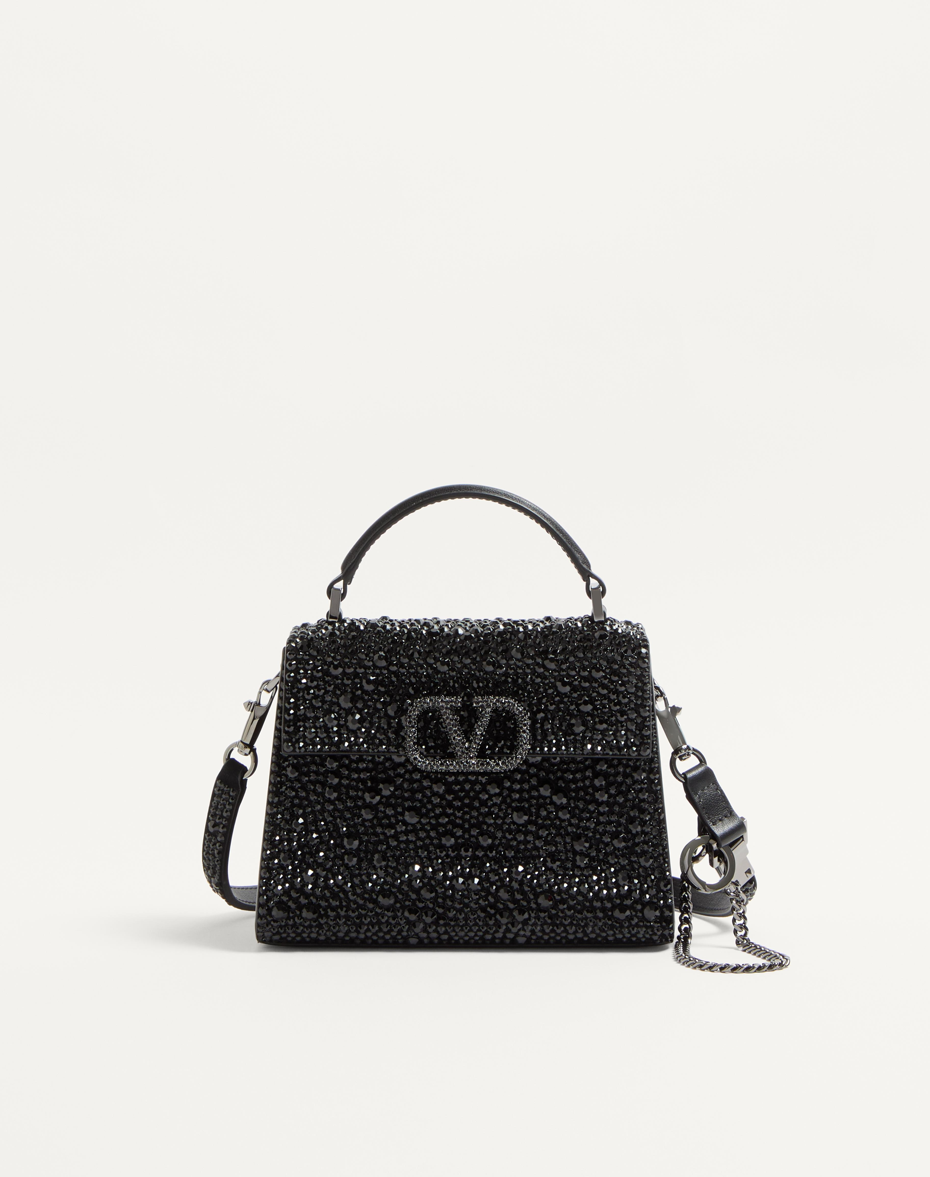 Valentino Garavani VSLING mini handbag entirely covered in rhinestones with VLogo Signature closure. The bag can be worn on the shoulder/crossbody thanks to its extendable shoulder strap, and handheld thanks to its handle. - Ruthenium-finish hardware - Magnetic closure with logo covered in Swarovski® crystals - Leather shoulder strap with adjustable chain - Protective feet - Nappa lining. Interior: flat open pocket Shoulder strap (drop) length: min 45 cm - max 59 cm / min 17.7 in. - max 23.3 in. - Dimensions: W19xH13xD9 cm / W7.4xH5.1xD3.5 in. - Made in Italy Product code: ZW2B0G97TZA_7NM