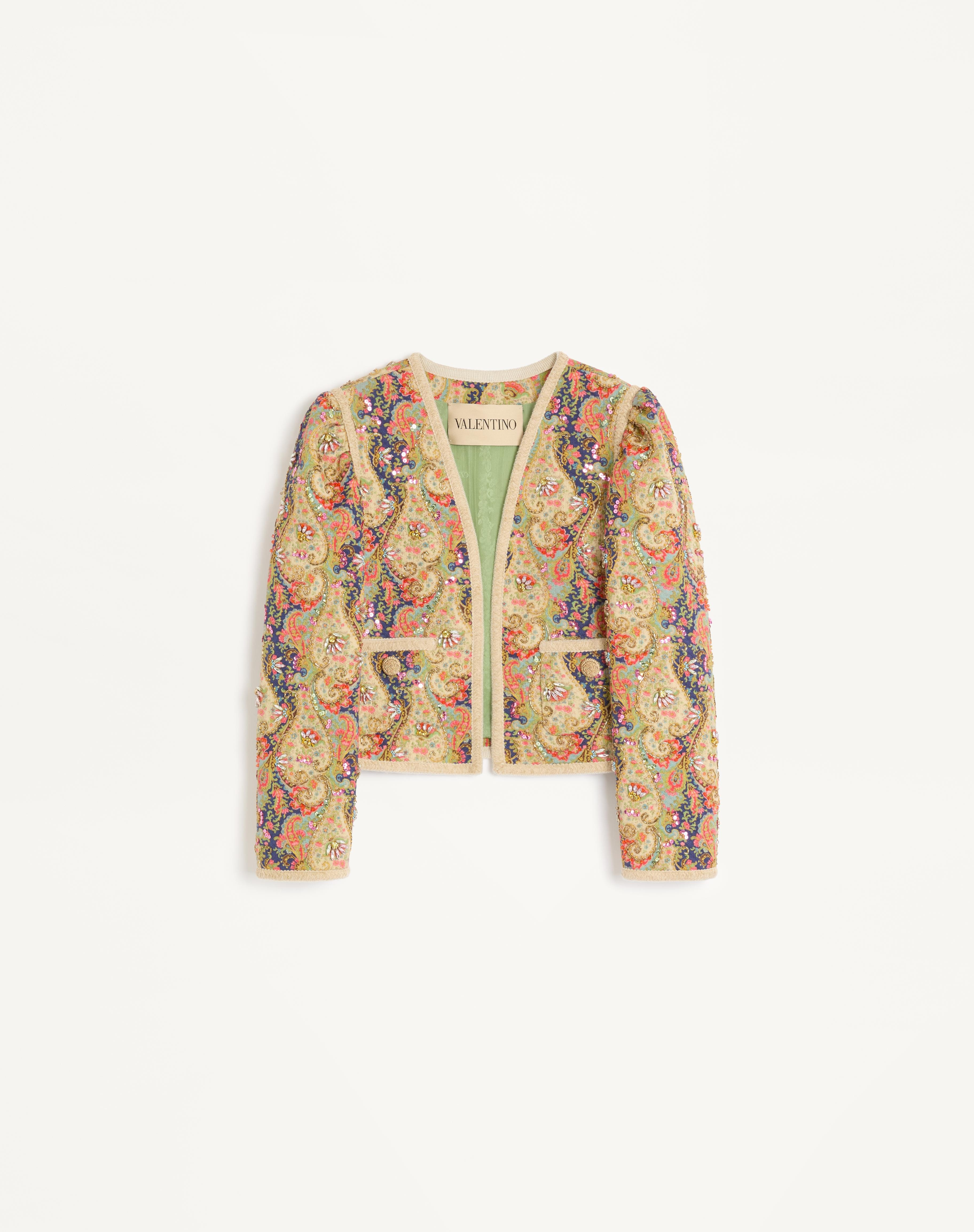 Piquet jacket with Voyage Imaginaire paisley print - Trimmed edges and pockets - Front hook closure - Voyage Imaginaire Paisley Piquet (100% Cotton) - Lining with Flowers, Stripes and VLogo (74% Acetate, 26% Silk) - Length: 51.5 cm / 20.3 in. from the shoulders in an Italian size 40 - The model is 176 cm / 5'9" tall and wears an Italian size 40 - Made in Italy The look of the model is completed by a Valentino Garavani Vain Bag and Valentino Garavani Shoes. Product code: 7B3CE4NA9AJ_M12