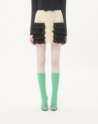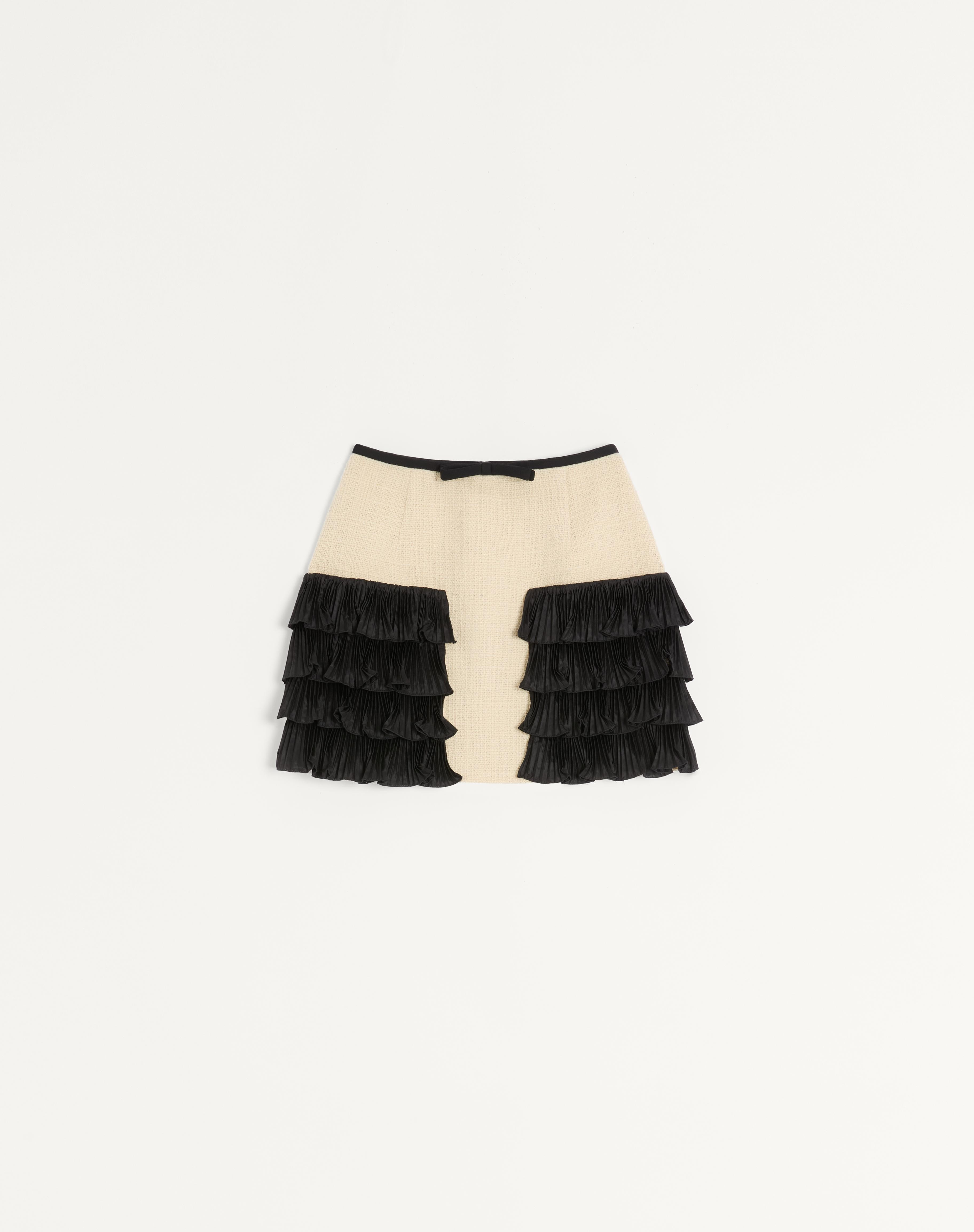 Plain Wool Tweed short skirt with pleated ruffles in Taffeta - Crepe Couture belt and bow - Rear zipper and hook-and-eye closure - Plain Wool Tweed (97% Virgin Wool, 3% Polyamide) - Lining with Flowers, Stripes, and VLogo (74% Acetate, 26% Silk) - Length: 85 cm / 34.3 in. from the waist in an Italian size 40 - The model is 176 cm / 5'9" tall and wears an Italian size 40 - Made in Italy The look of the model is completed by a Valentino Garavani Vain Bag and Valentino Garavani Dans Le Foyer Shoes. Product code: 7B0RADX190Y_DNG