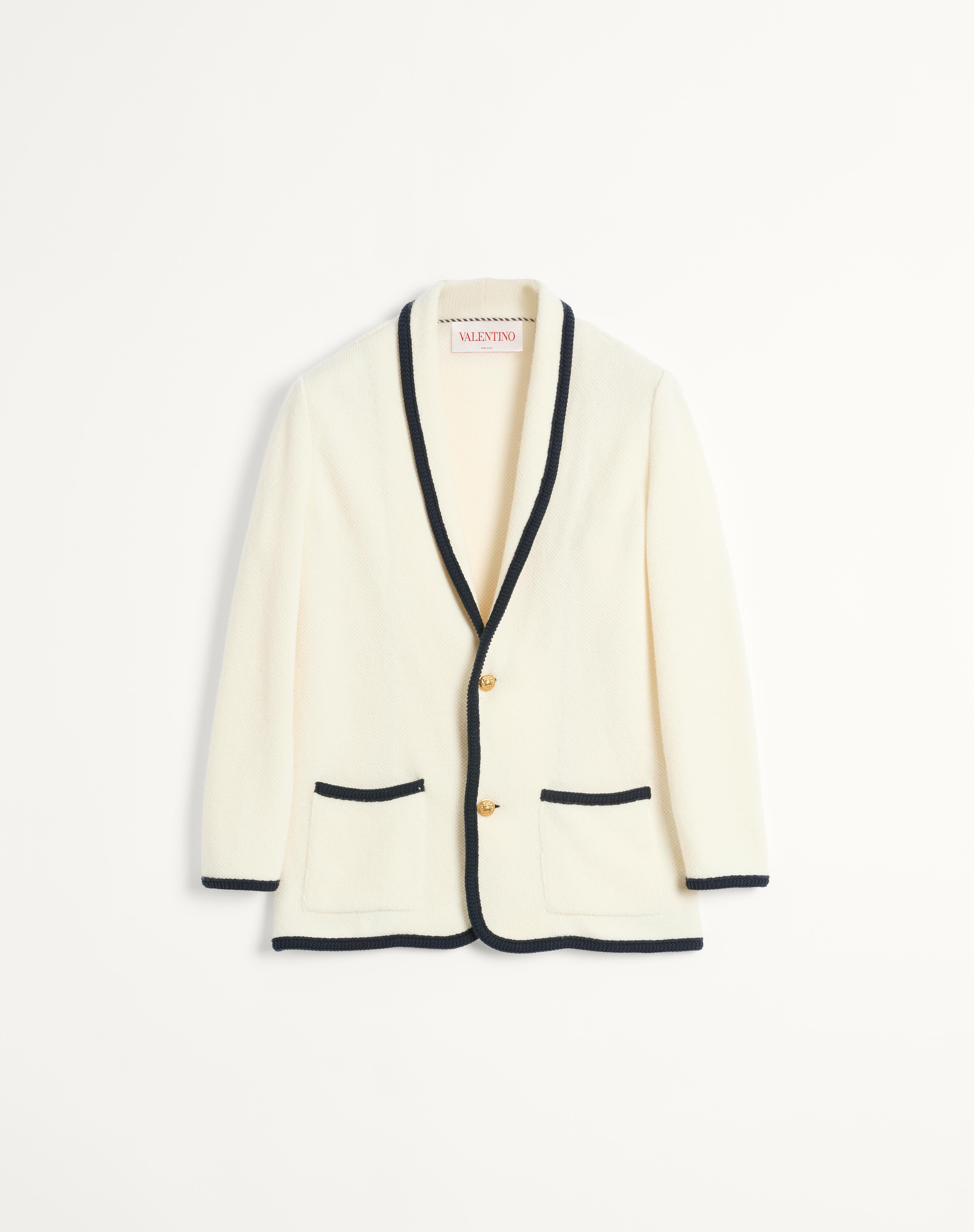Valentino single-breasted jacket in wool and cotton with torchon piping - Regular fit - Fineness: 7 - Torchon piping - Button closure - Two front flap pockets - Composition: 87% Virgin Wool, 13% Cotton - Length: 74 cm / 29.1 in. from the back of the neck in a size M - The model is 187 cm / 6'1" tall and wears a size M - Made in Italy The look of the model is completed by a Valentino Garavani 9TO5 Bag and Valentino Garavani Bay By Bay Shoes. Product code: 6V3KE02TAR2_RGY