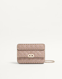 Small Valentino Garavani Rockstud Spike chain bag in supple lambskin Nappa. Quilted construction, embellished with small studs. Equipped with both a detachable sliding chain strap and a detachable handle, this accessory can be worn as a crossbody/shoulder bag or used as a handbag. - Quilted Nappa. Argyle pattern enhanced by tone-on-tone stitching - Platinum-finish studs and hardware - Twist-lock closure - Nappa lining. Interior: open red leather pocket - Dimensions: W20xH11.5xD5 / W7.9xH4.5xD2 in. - Weight: 0.56 Kg / 1.2 lbs - Made in Italy Product code: 7W2B0123NAP_P45