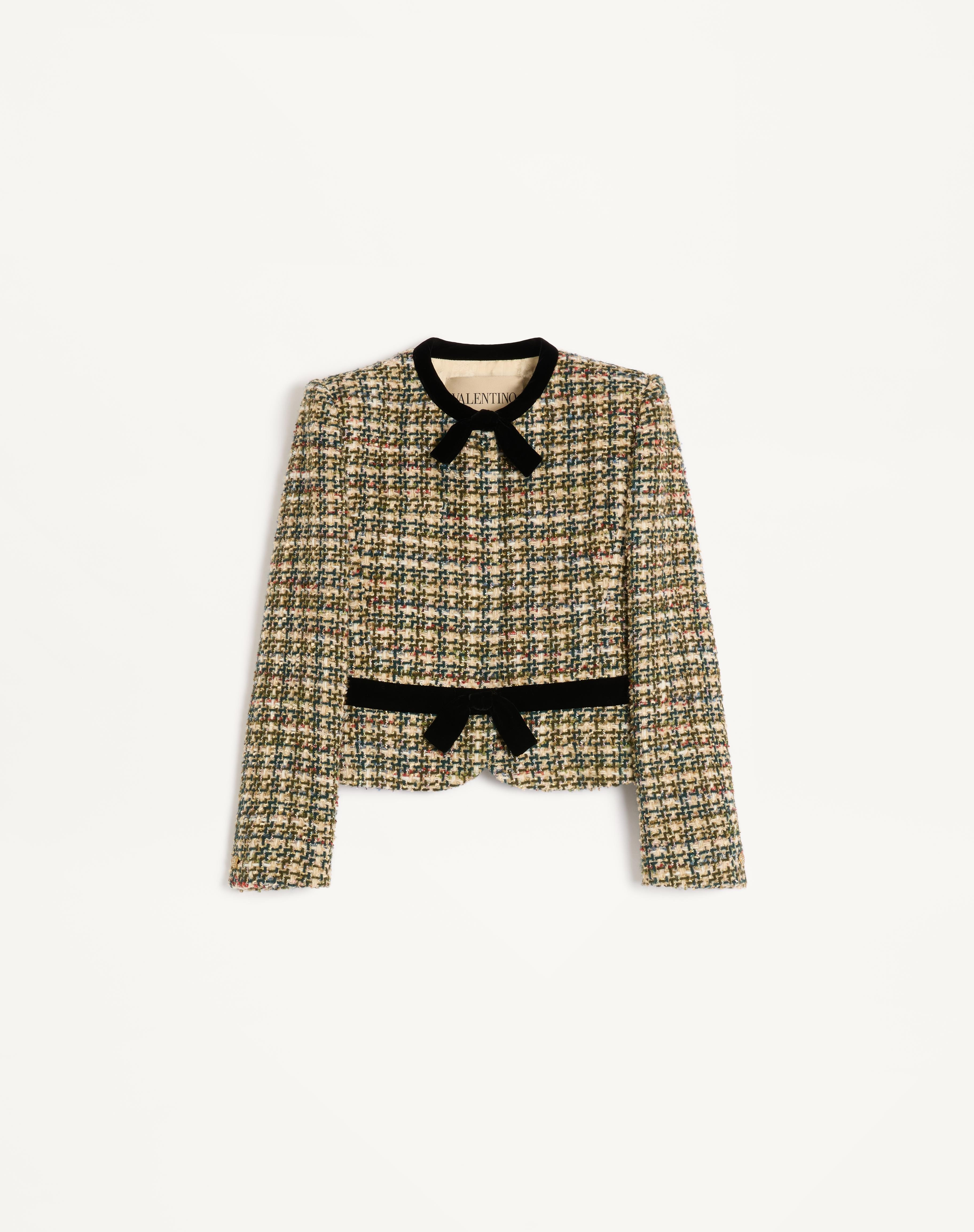 Tweed jacket with velvet details - Shoulder pads - Front snap button closure - Multicolor Tweed (33% Polyamide, 31% Acrylic, 31% Wool, 5% Polyester) - VLogo Jacquard Flower Lining (75% Acetate, 25% Silk) - Length: 51 cm / 20.1 in. from the shoulders in an Italian size 40 - The model is 176 cm / 5'9" tall and wears an Italian size 40 - Made in Italy The look of the model is completed by a Valentino Garavani Vain Bag and Valentino Garavani Shoes. Product code: 7B0CE4T09R6_M12