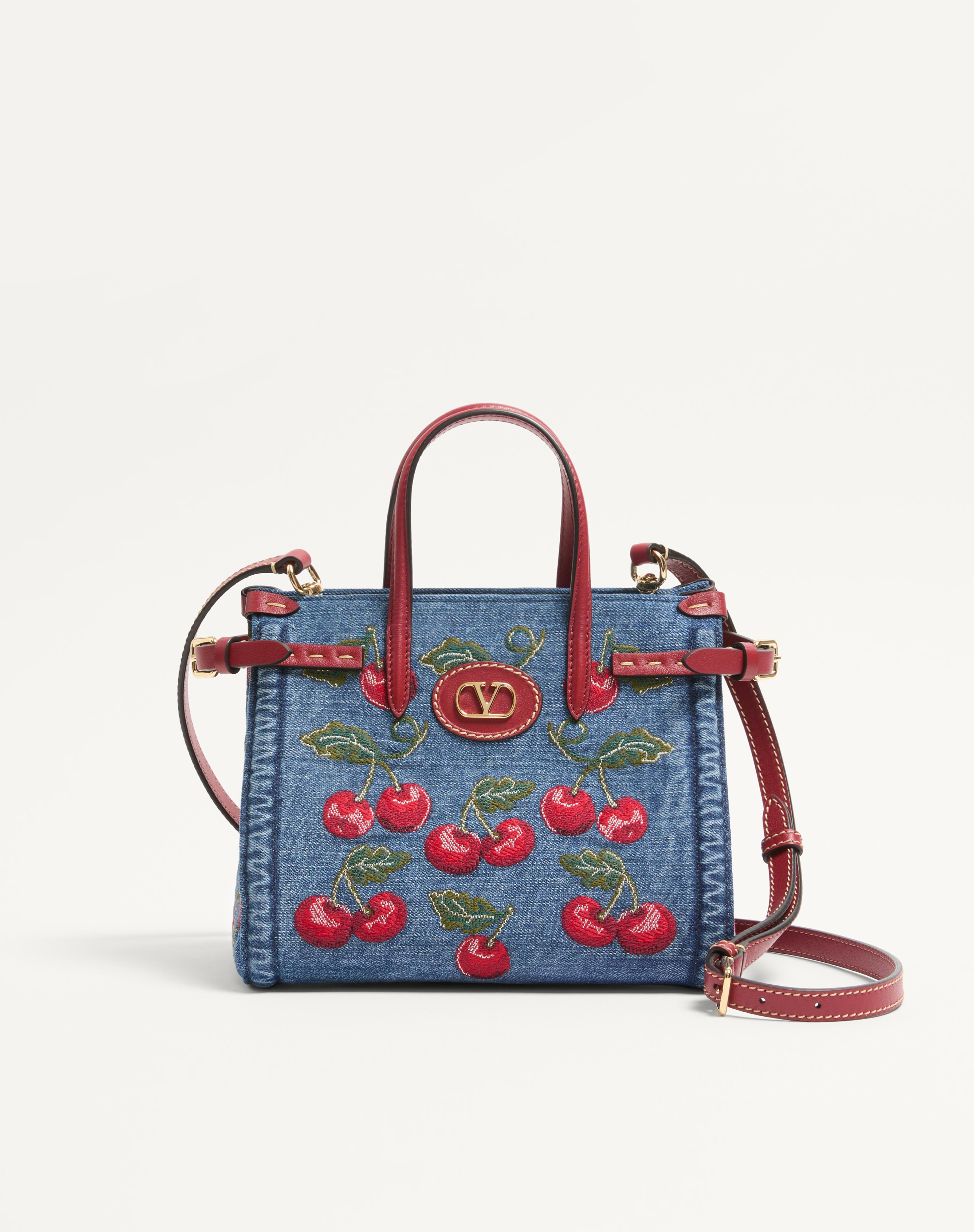 VALENTINO GARAVANI ANTIBES SMALL SHOPPING BAG IN DENIM WITH CHERRYFIC EMBROIDERY