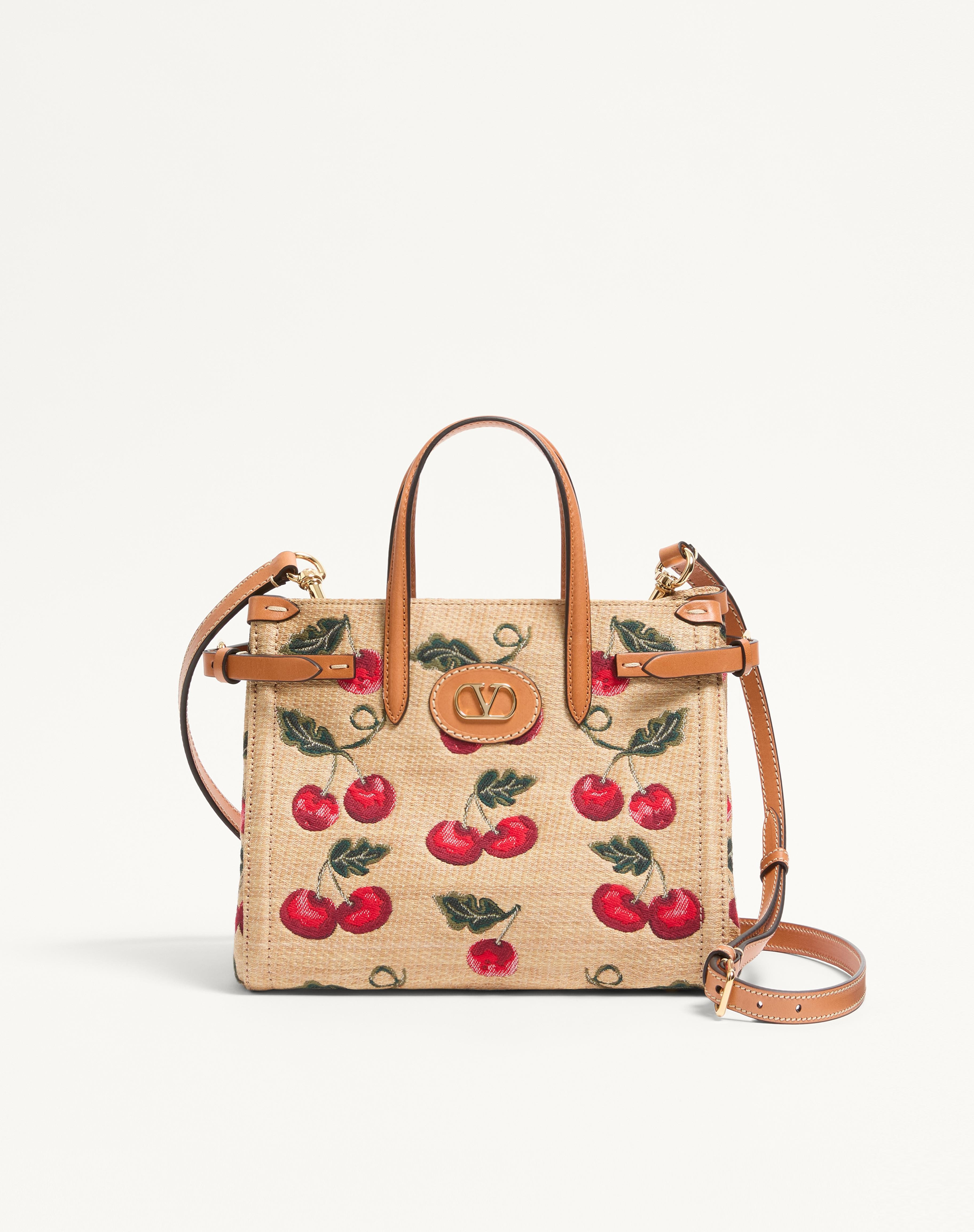 Valentino Garavani Antibes small shopping bag in synthetic jacquard raffia with a Cherryfic motif, detailed with side buckles and a leather patch with VLogo Signature metal feature. The bag can be handheld or comfortably worn on the shoulder/crossbody thanks to the handles and shoulder strap. - Gold-finish hardware - Protective feet - Canvas lining. Interior: slip pocket with zip - Double leather handles - Adjustable and removable leather shoulder strap - Adjustable buckles on the sides to change bag capacity - Handle drop length: 16 cm / 6.3 in. - Shoulder strap drop length: 55 cm / 21.7 at the central hole - Dimensions: W22xH19xD12 cm / W8.7xH7.5xD4.7 in. - Made in Italy This product contains magnets. Please consider if this product will be worn within 15 cm from any implanted device. Any concerns please contact your healthcare professional. Product code: 6W0B0R20MCZ_R9F