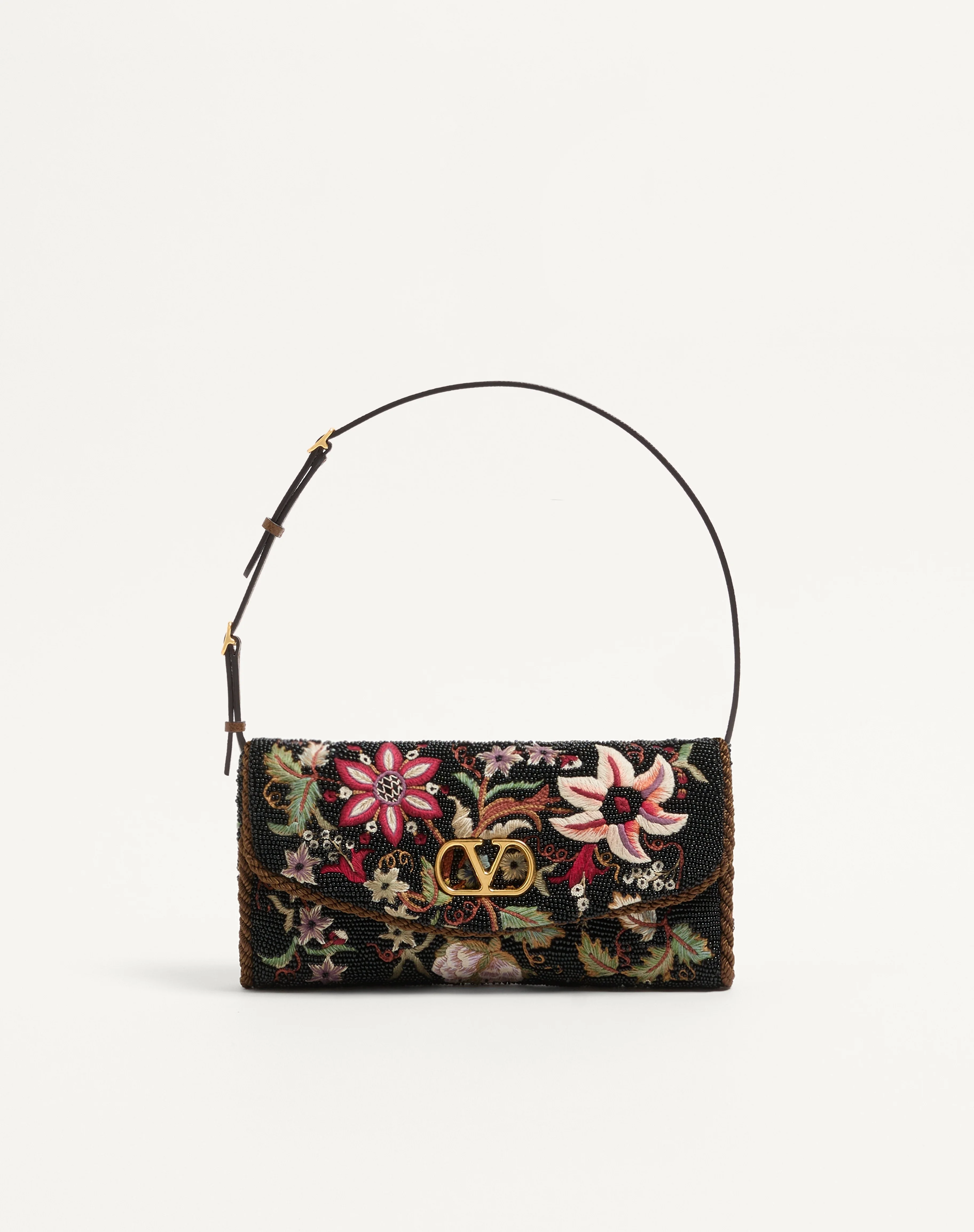 Valentino Garavani DeVain small shoulder bag with floral embroidery on a black beaded base with metallic VLogo Signature detail. The bag can be carried by hand or worn over the shoulder. - Antique brass-finish hardware - Details and adjustable handle in grained calfskin - Magnetic closure with VLogo in antique brass finish - Satin lining. Interior: slip pocket - This model has an additional leather section that can be attached to the bag with buckles - Handle drop length with additional section: 19 cm / 7.5 in. at the centre hole - Dimensions: W23.5xH12xD3 cm / W9.2xH4.7xD1.2 in. - Made in Italy This product contains magnets. Please consider if this product will be worn within 15 cm from any implanted device. Any concerns please contact your healthcare professional. Product code: 7W2B0T31LTT_DEY