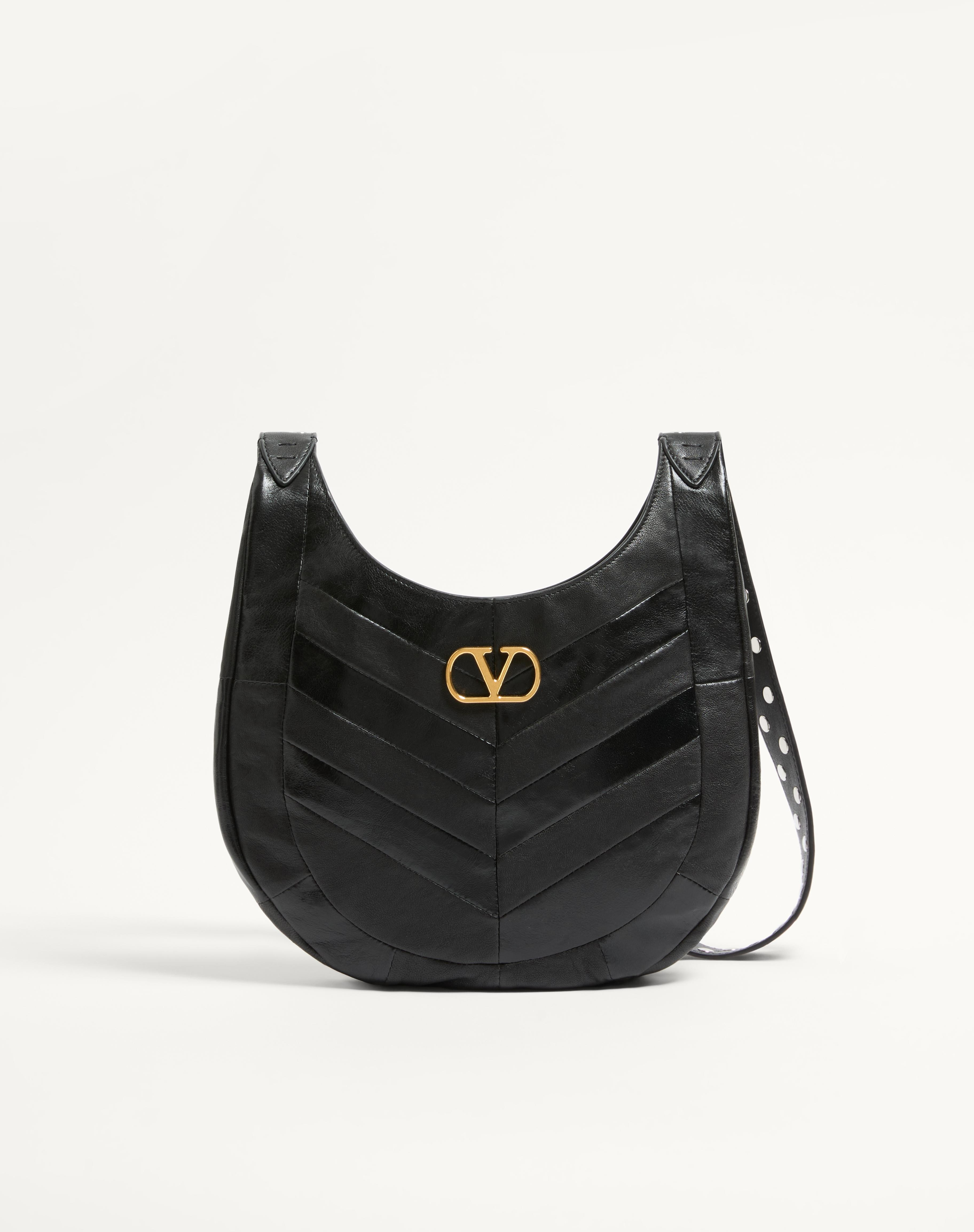 Valentino Garavani Hoboho small hobo bag with patchwork design in shiny and matte chevron-patterned nappa leather. VLogo Signature metal feature in antique brass finish. The bag can be worn on the shoulder or crossbody thanks to the adjustable shoulder strap. - Adjustable leather shoulder strap decorated with palladium-finish studs - Shoulder strap drop length: 34 cm / 13.4 in. at the center hole - This model features an additional leather shoulder strap section that can be attached to the bag with buckles - Shoulder strap drop length with additional section: 46 cm / 18.1 in. at the center hole - Nappa leather lining - Dimensions: W28xH21.5xD3 cm / W11xH8.5xD1.2 in. - Made in Italy Product code: 7W0B0S63GHA_0NO